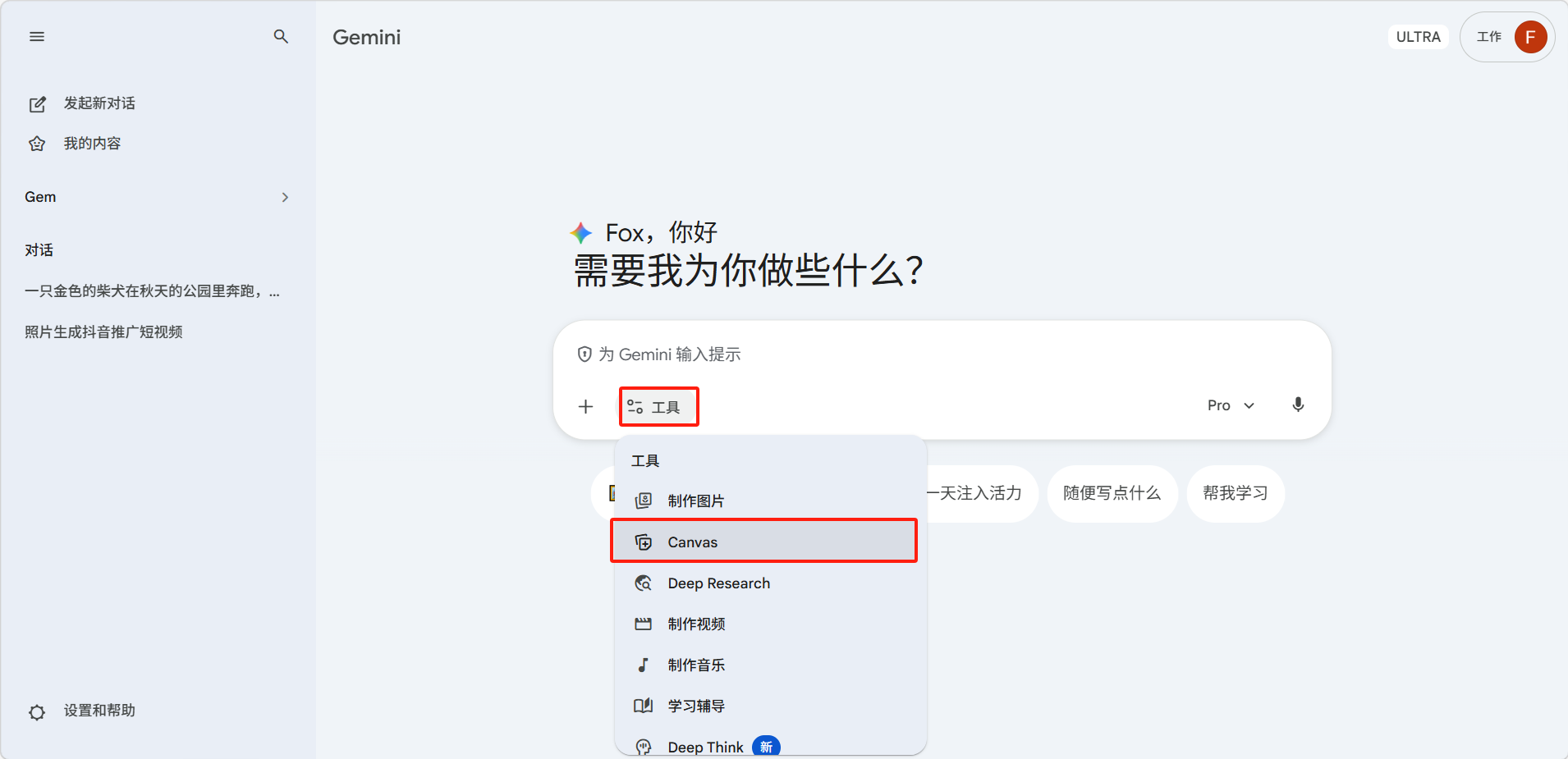 点击输入框下方的「工具」按钮,选择「Canvas」。也可以在对话中直接说: