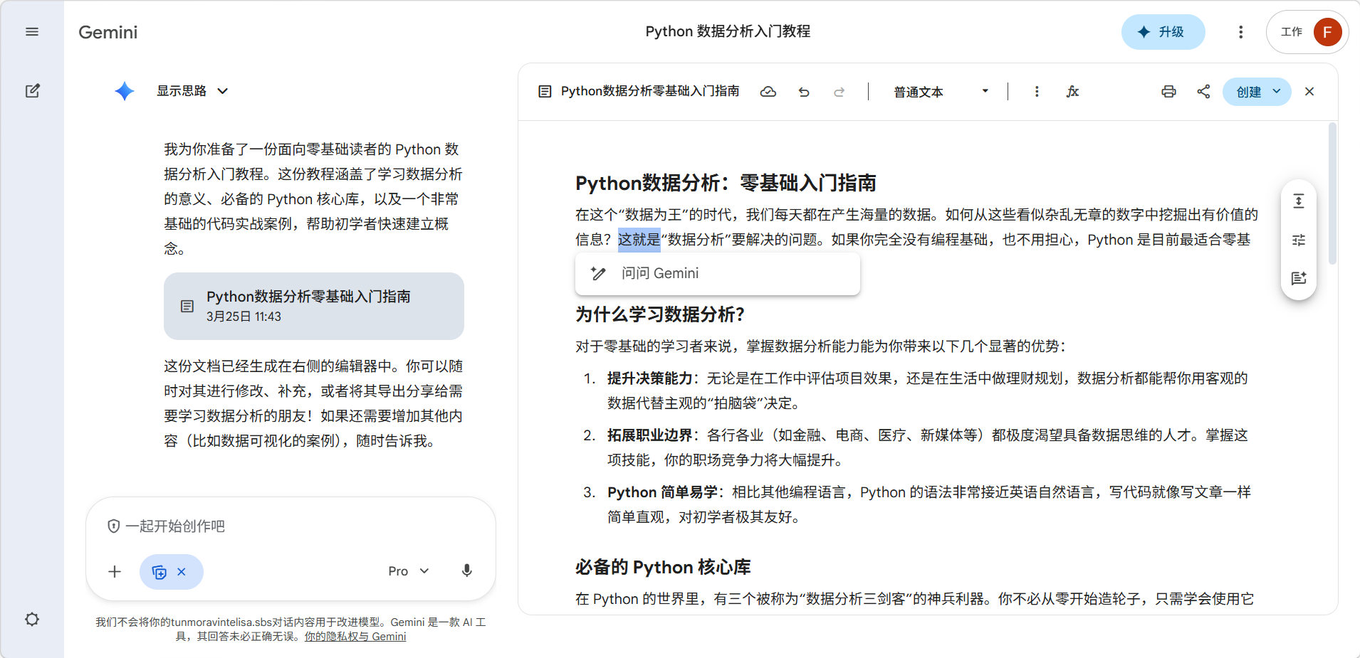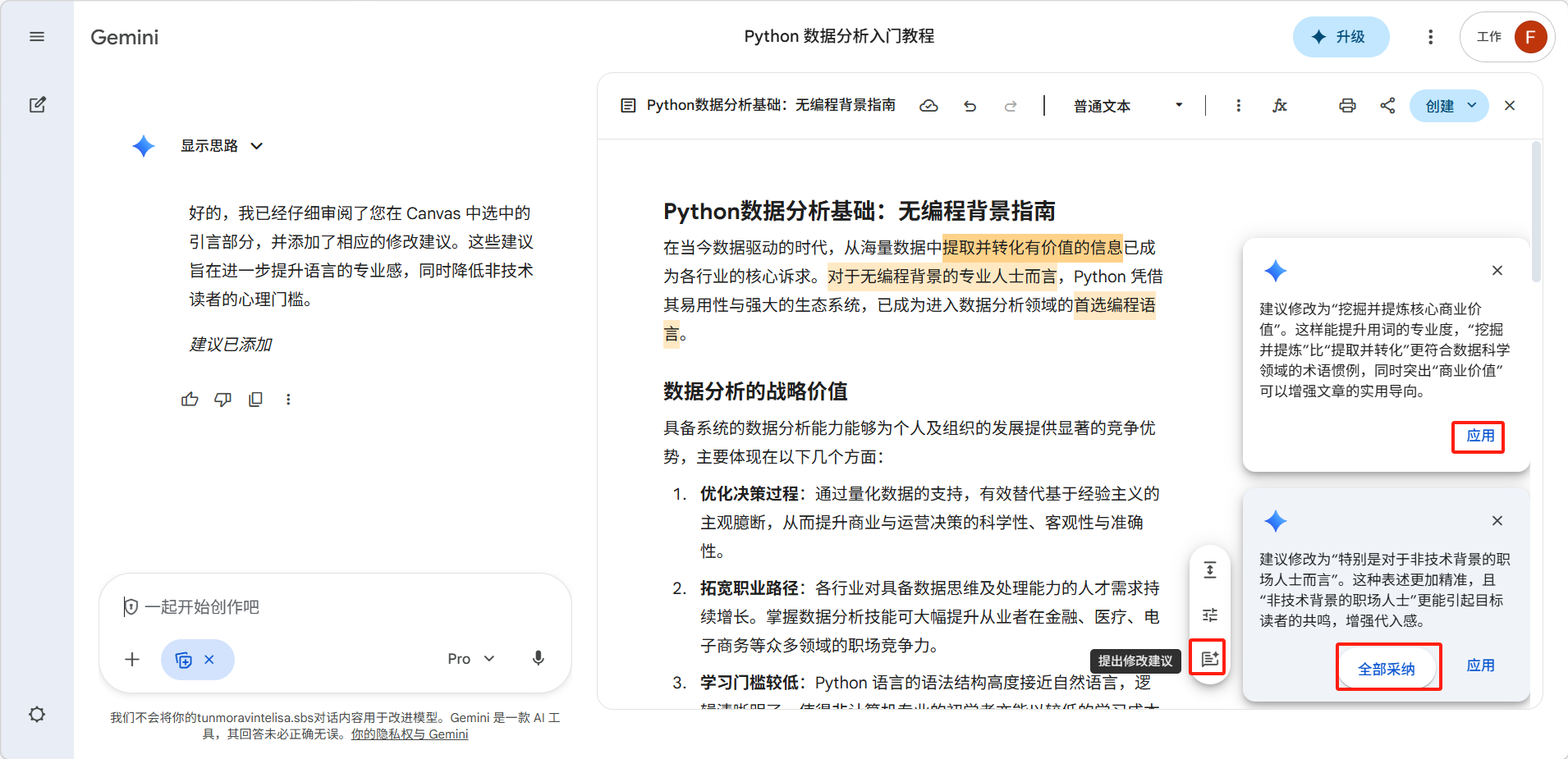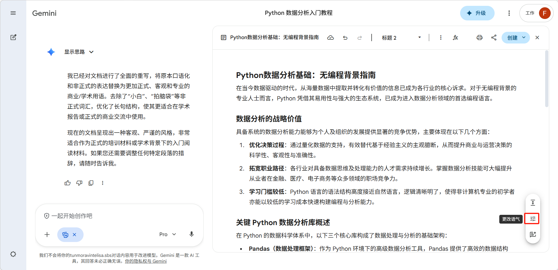 善用"选中段落"编辑: 在写作模式下,你可以选中某一段文字单独让 Gemini 修改,而不是每次都重写全文。这对微调很有帮助。