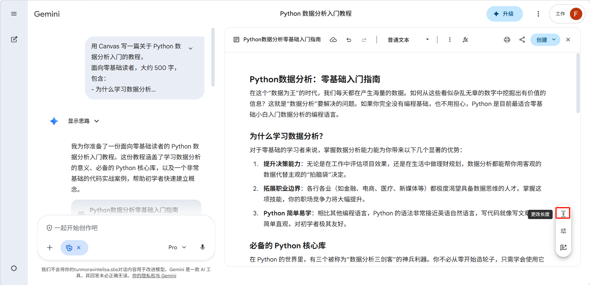 1. 写作模式 — 你可以生成初稿,然后使用快速编辑工具对语气、长度或格式进行完善,向 Gemini 征求对特定部分或整个文档的反馈意见。 你也可以自行手动修改画布里的内容,然后再通过聊天请 Gemini 根据修改后的内容重新调整,实现双向协作。