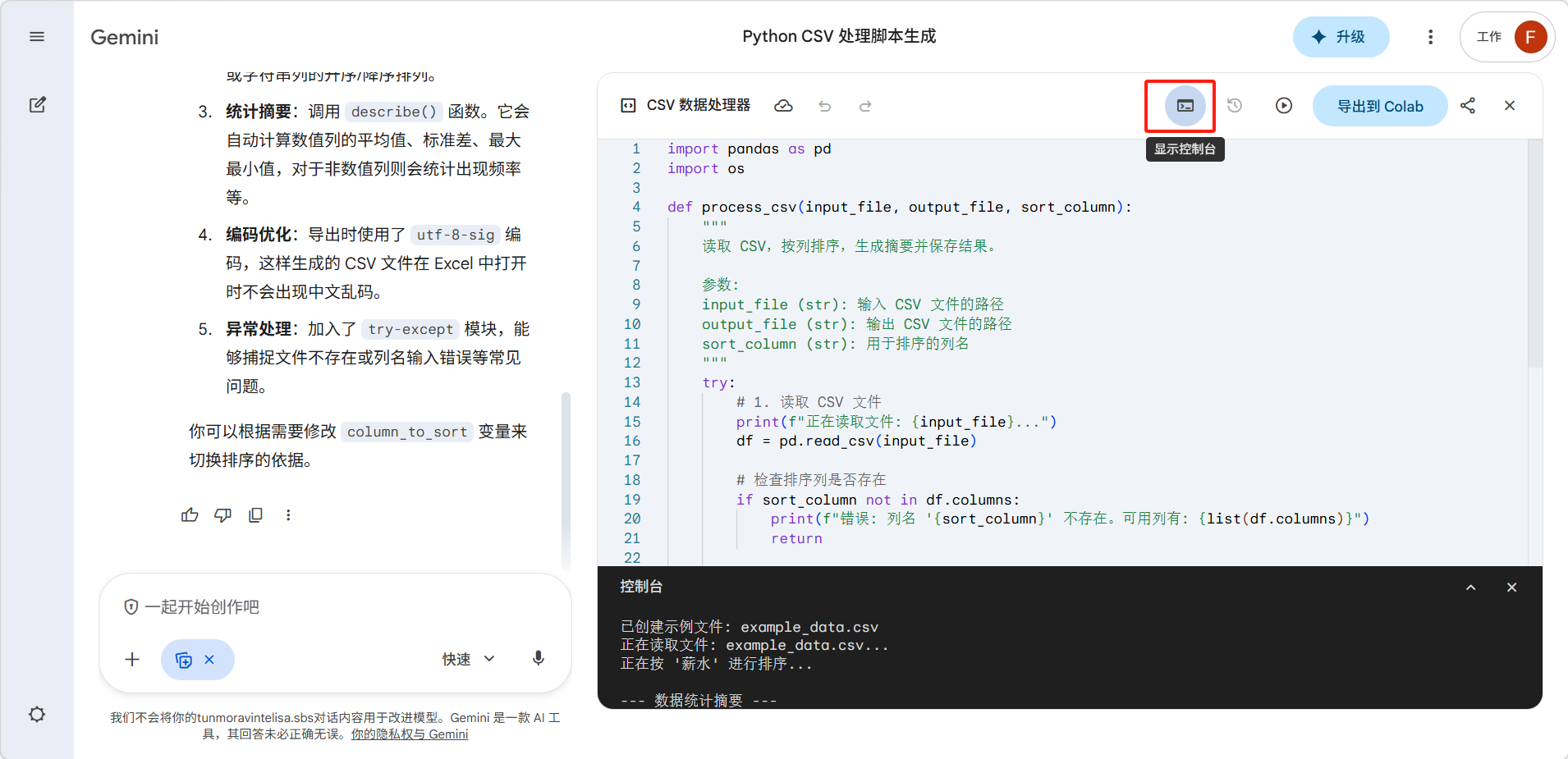 Python 导出到 Colab: Canvas 支持将 Python 代码导出到 Google Colab,方便后续在 Notebook 环境中继续开发。