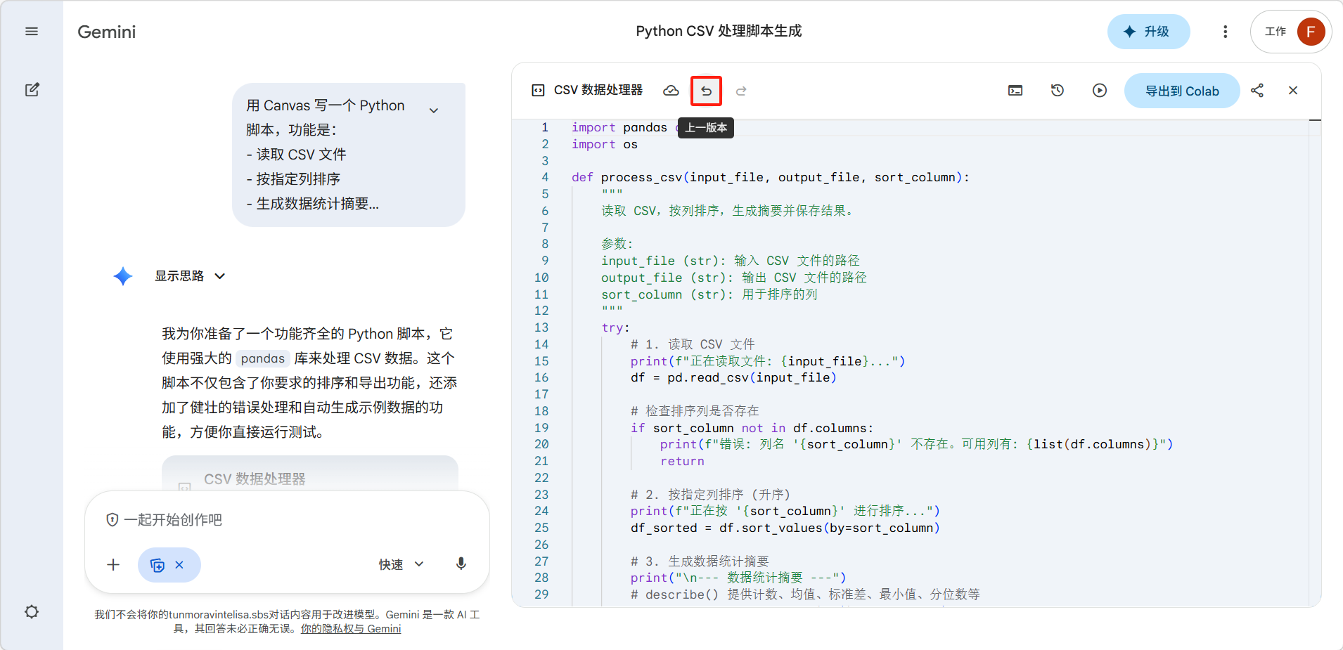 Canvas 是 Gemini 内置的协作式创作面板,类似于一个可以与 AI 实时协作的文档编辑器。当你需要撰写长文本或编写代码时,Canvas 能提供比普通对话更好的编辑体验。