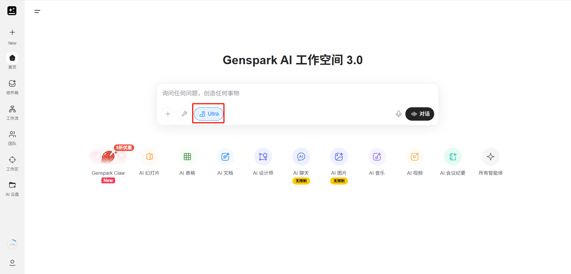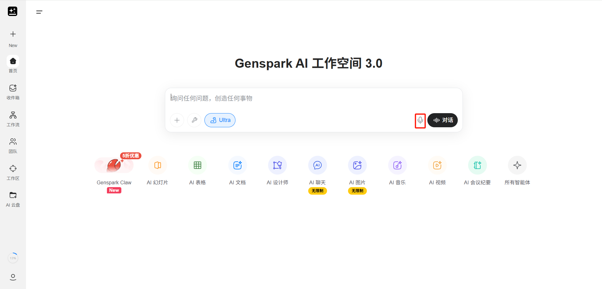 进入 Genspark 首页后,在中央聊天框中直接输入用户的问题或指令,点击「对话」按钮即可发送。系统默认使用超级智能体来处理用户的请求。