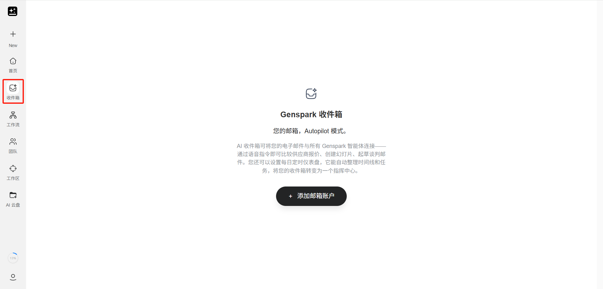 收件箱是 Genspark 中接收推荐内容和通知的入口。在左侧边栏点击「收件箱」图标即可进入。收件箱中会展示系统推荐的内容和更新通知。