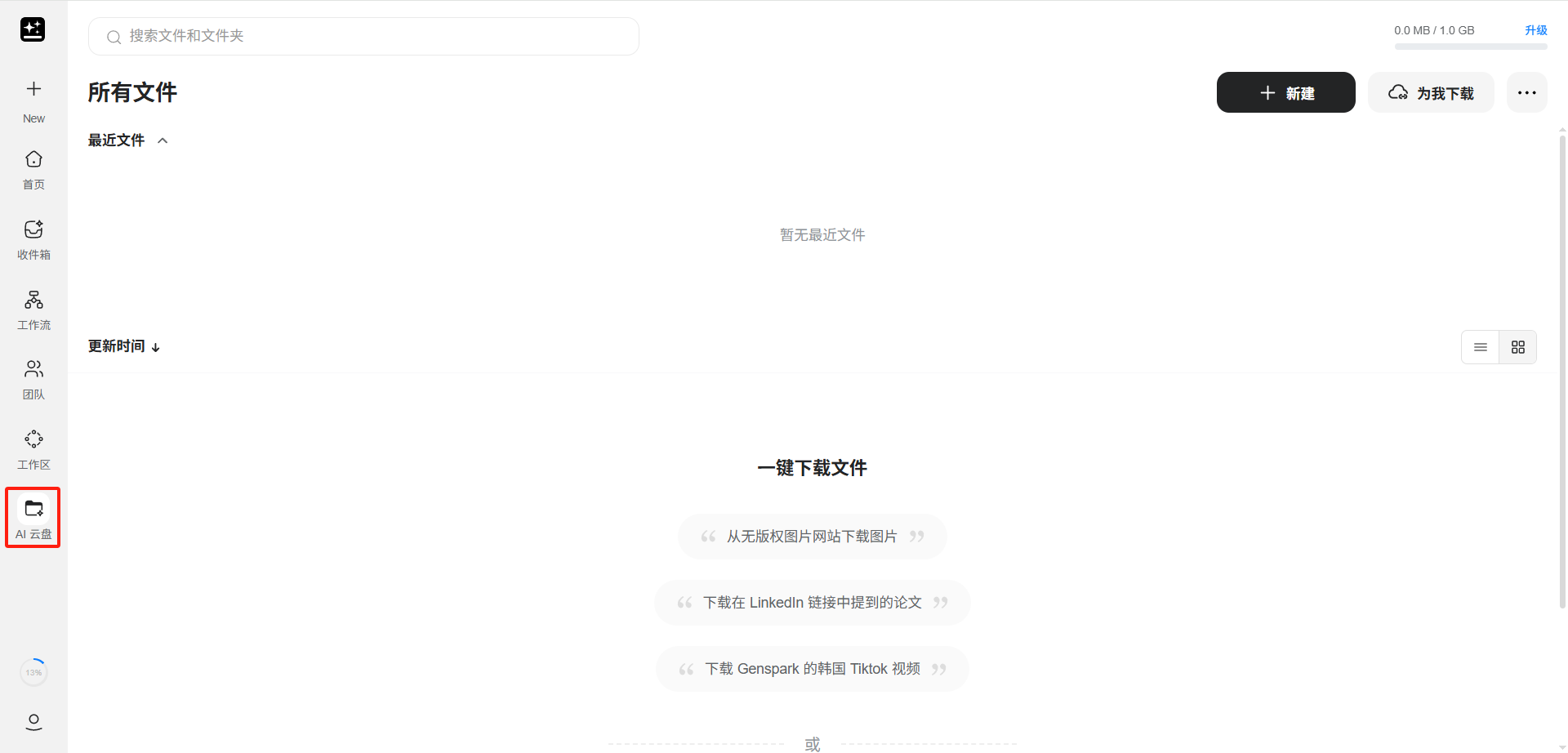 AI 云盘是 Genspark 提供的云存储空间,用于保存和管理用户在平台上创建或下载的各种文件。用户可以在左侧边栏底部点击「AI 云盘」图标进入,管理已保存的文件、文档、图片、视频和音频等资源。