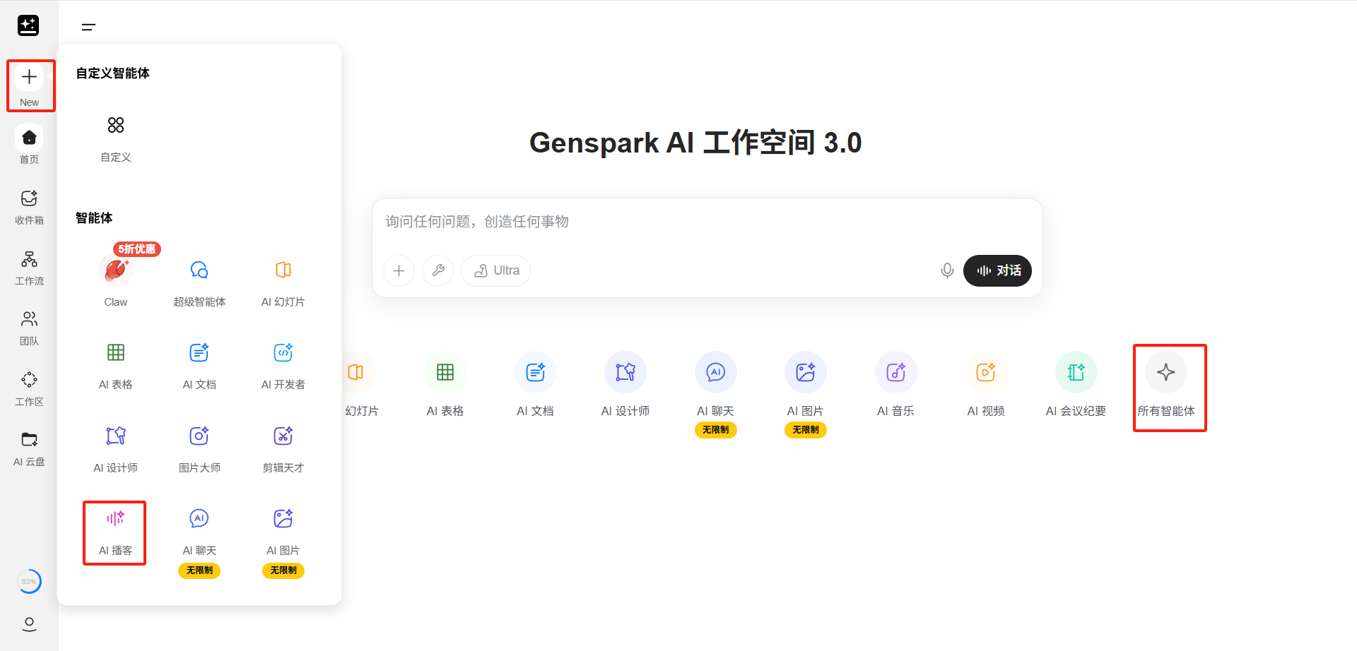 点击左侧边栏「New」>「AI播客」或页面右边「所有智能体」进入。