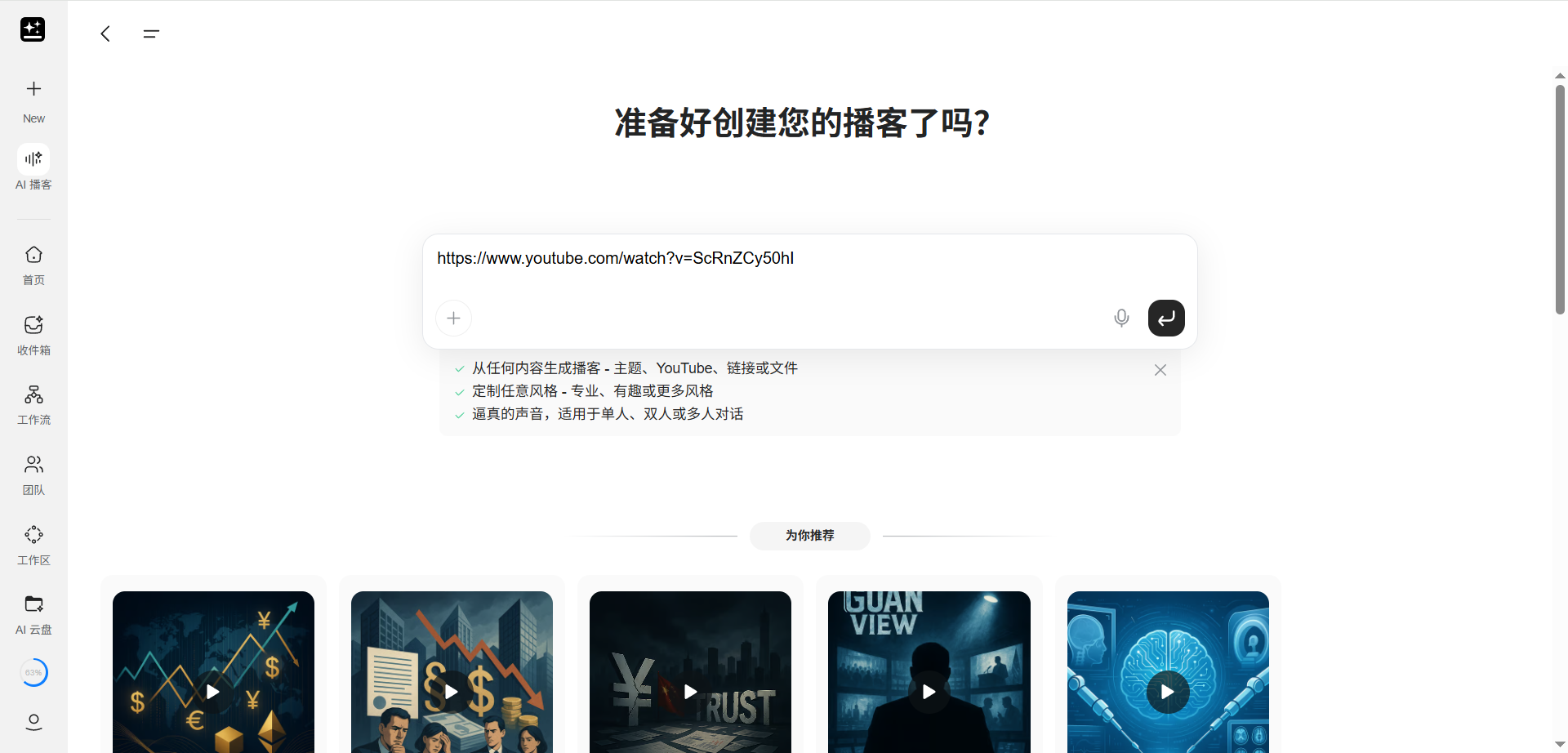 - 多种导入方式:从任何内容生成播客 - 主题、YouTube、链接或文件