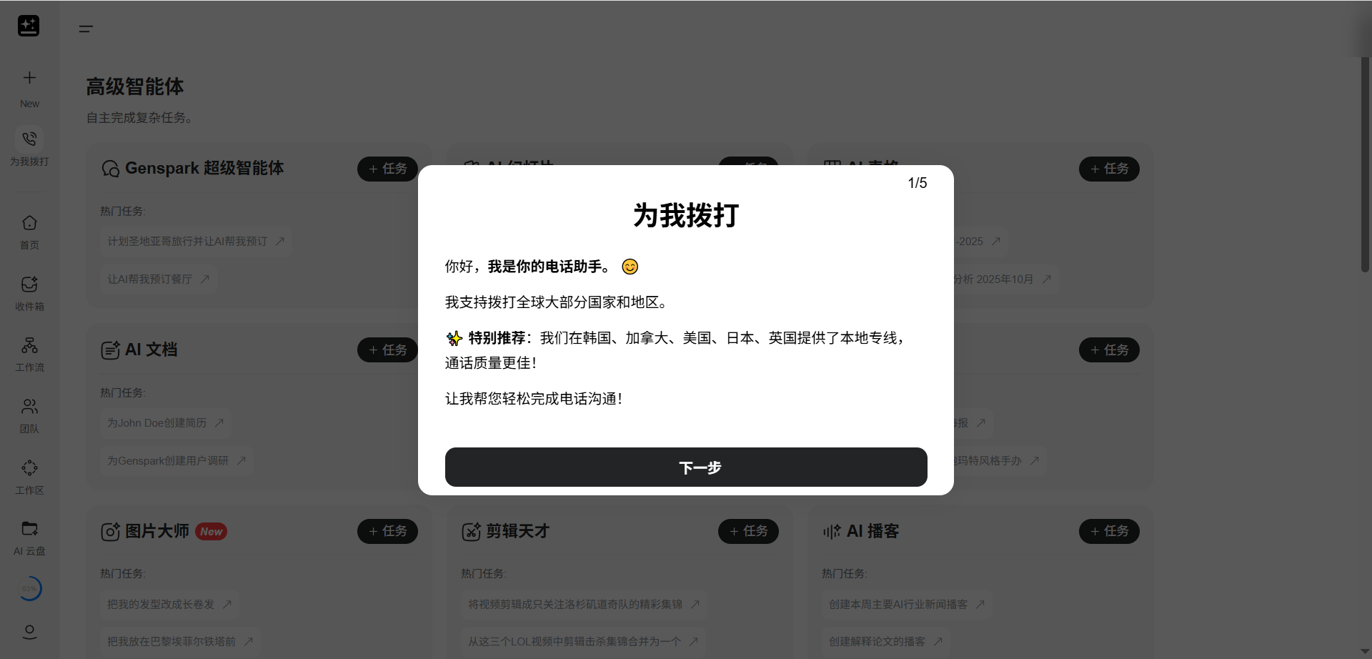 为我拨打(Call for Me)是 Genspark 最具特色的功能之一——AI 可以代表用户向企业或个人联系人拨打真实电话。只需描述用户的需求,AI 就会自动处理整个通话过程。通话完成后用户可以查看完整的对话记录和结果摘要。点击「New」>「为我拨打」即可进入。
