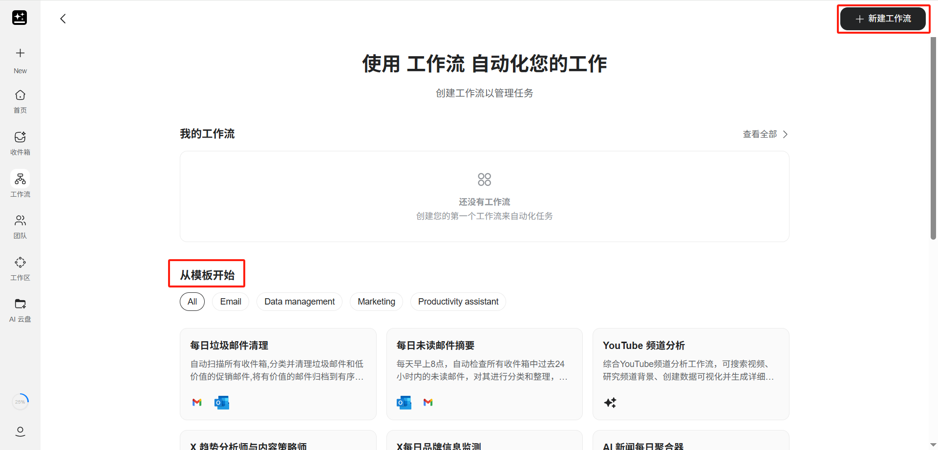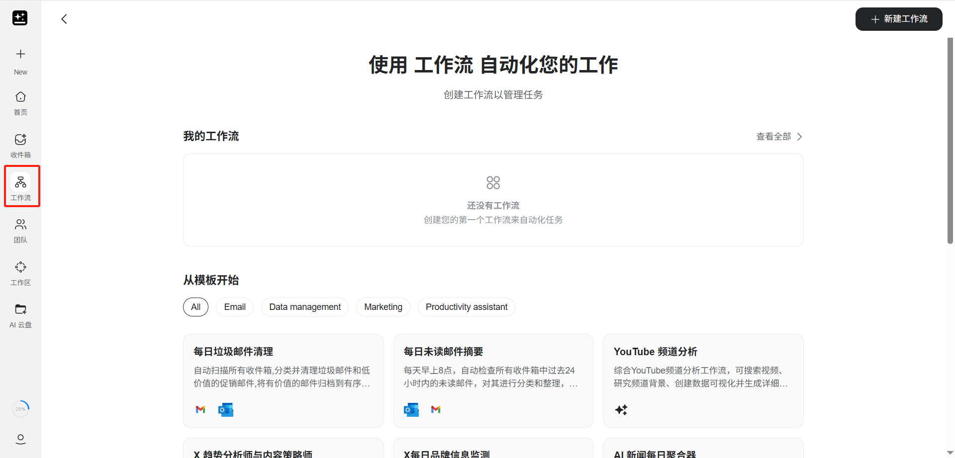 点击左侧边栏的「工作流」图标进入工作流管理页面。页面上方展示「我的工作流」列表(已创建的工作流),下方展示「从模板开始」区域,提供多种预置模板供快速使用,包括 Email、Data management、Marketing、Productivity assistant 等分类。