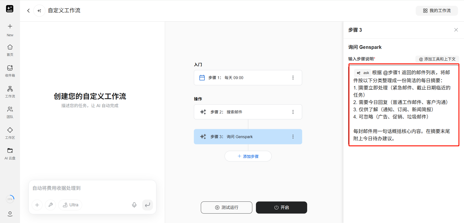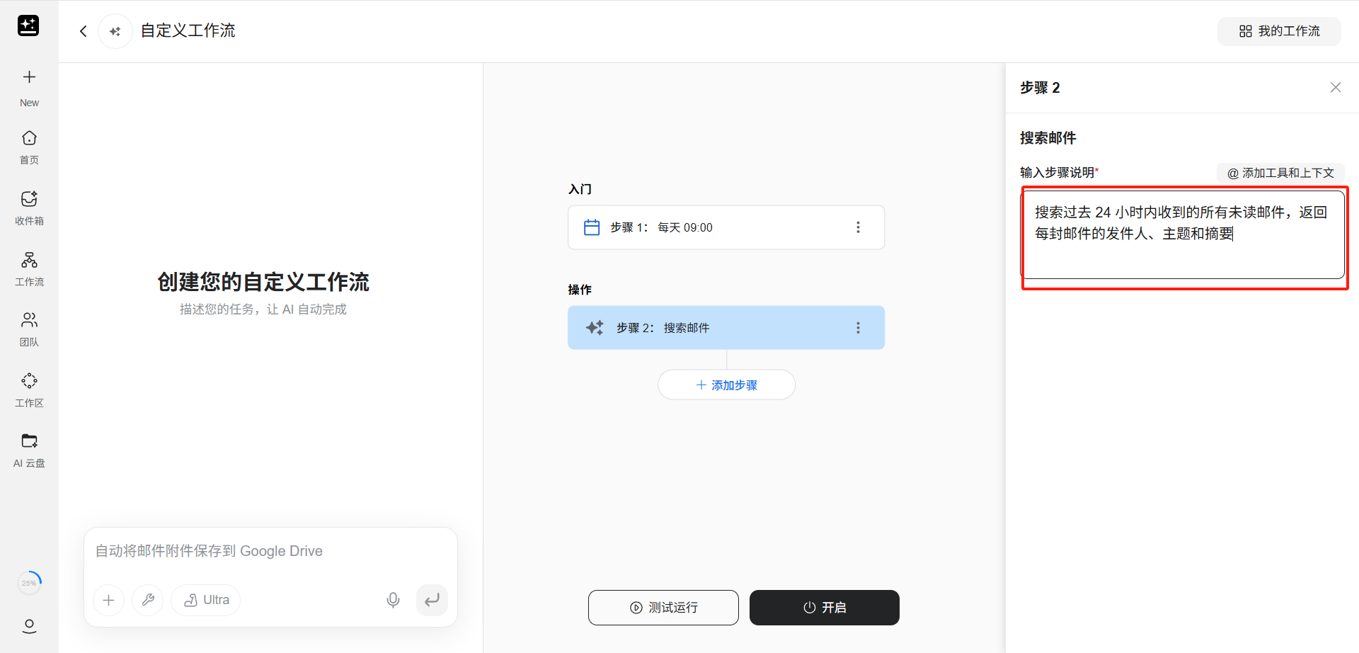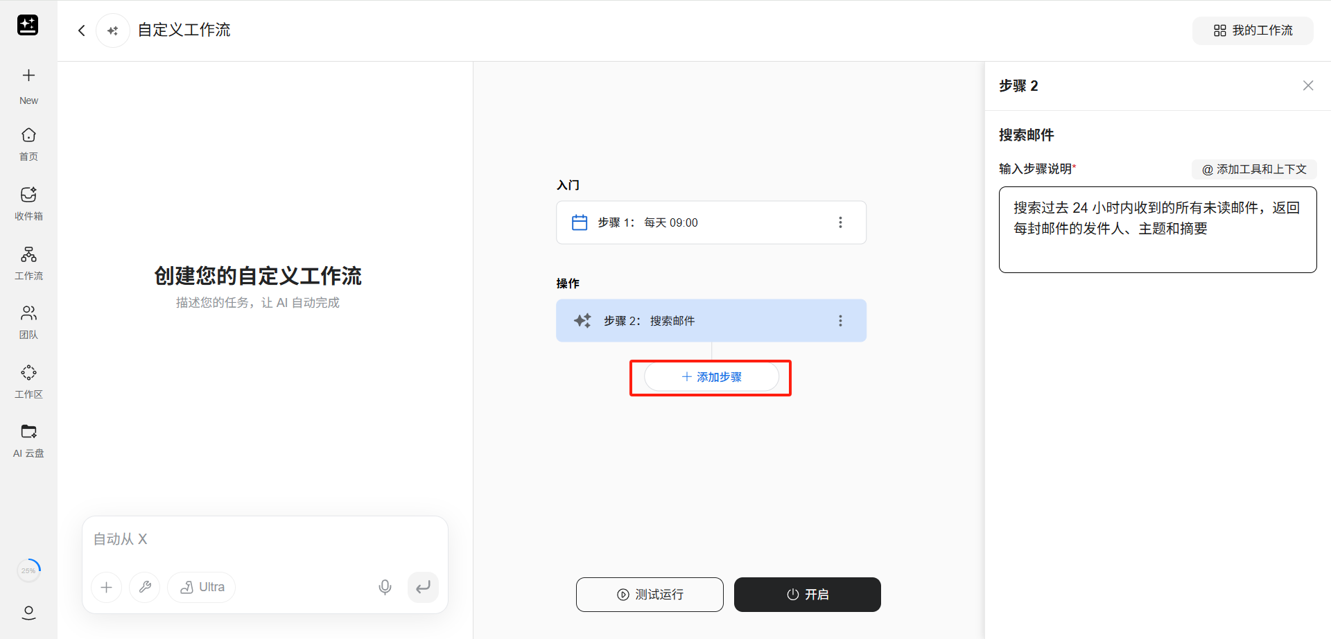 若不想手动配置,在页面左侧的对话框中,用户也可以用自然语言描述整个自动化需求,AI 会自动帮用户构建包含触发器和操作步骤的完整工作流。