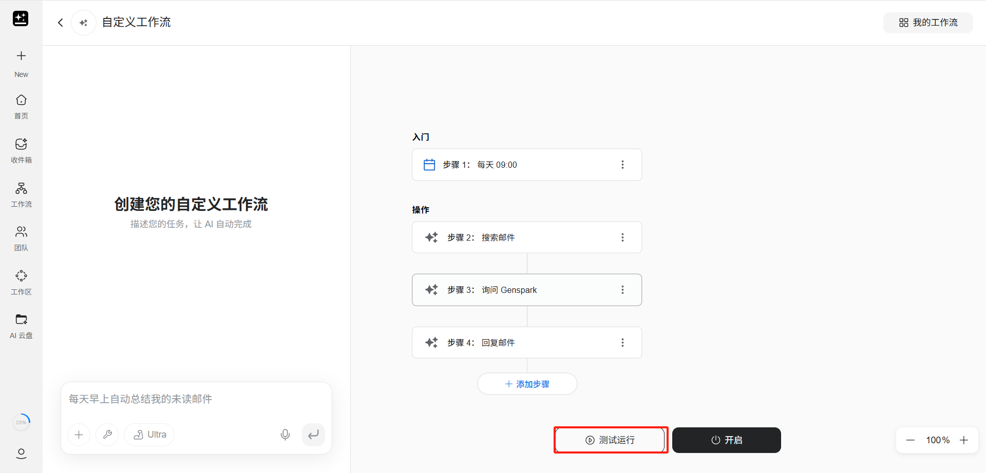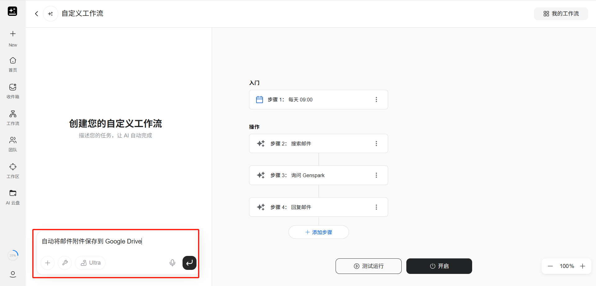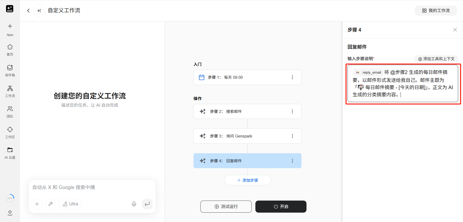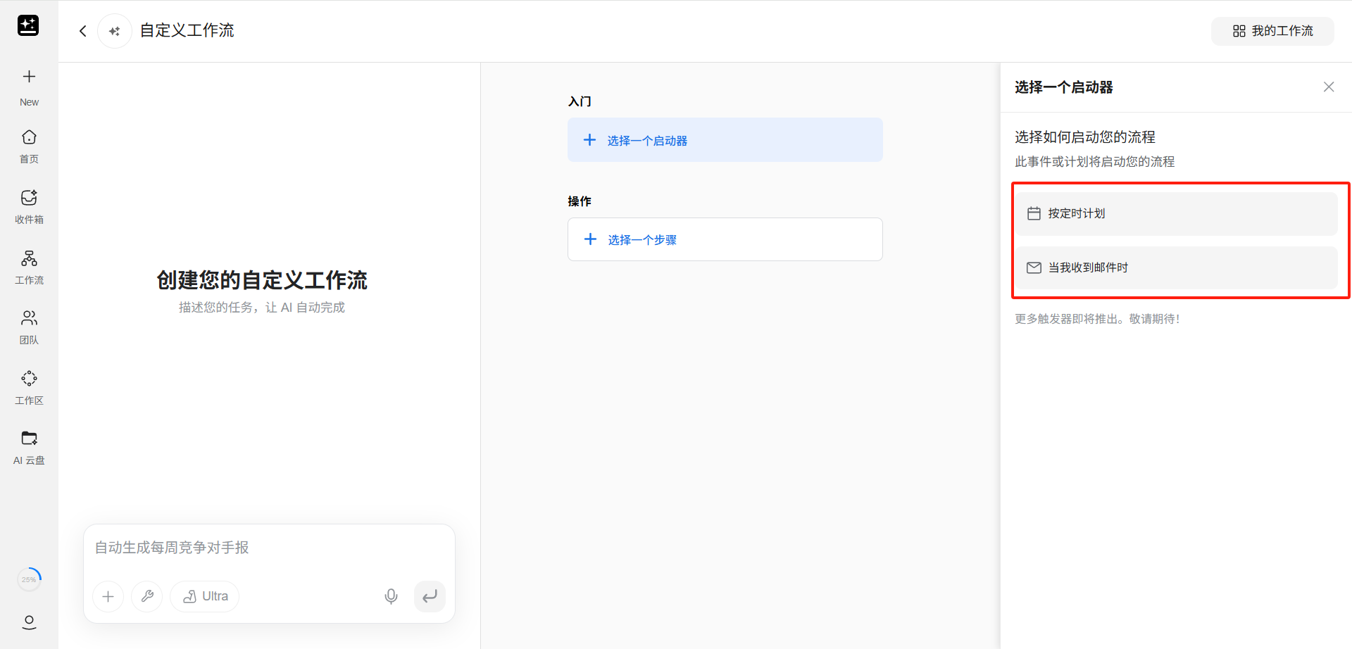 若不想手动配置,在页面左侧的对话框中,用户也可以用自然语言描述整个自动化需求,AI 会自动帮用户构建包含触发器和操作步骤的完整工作流。