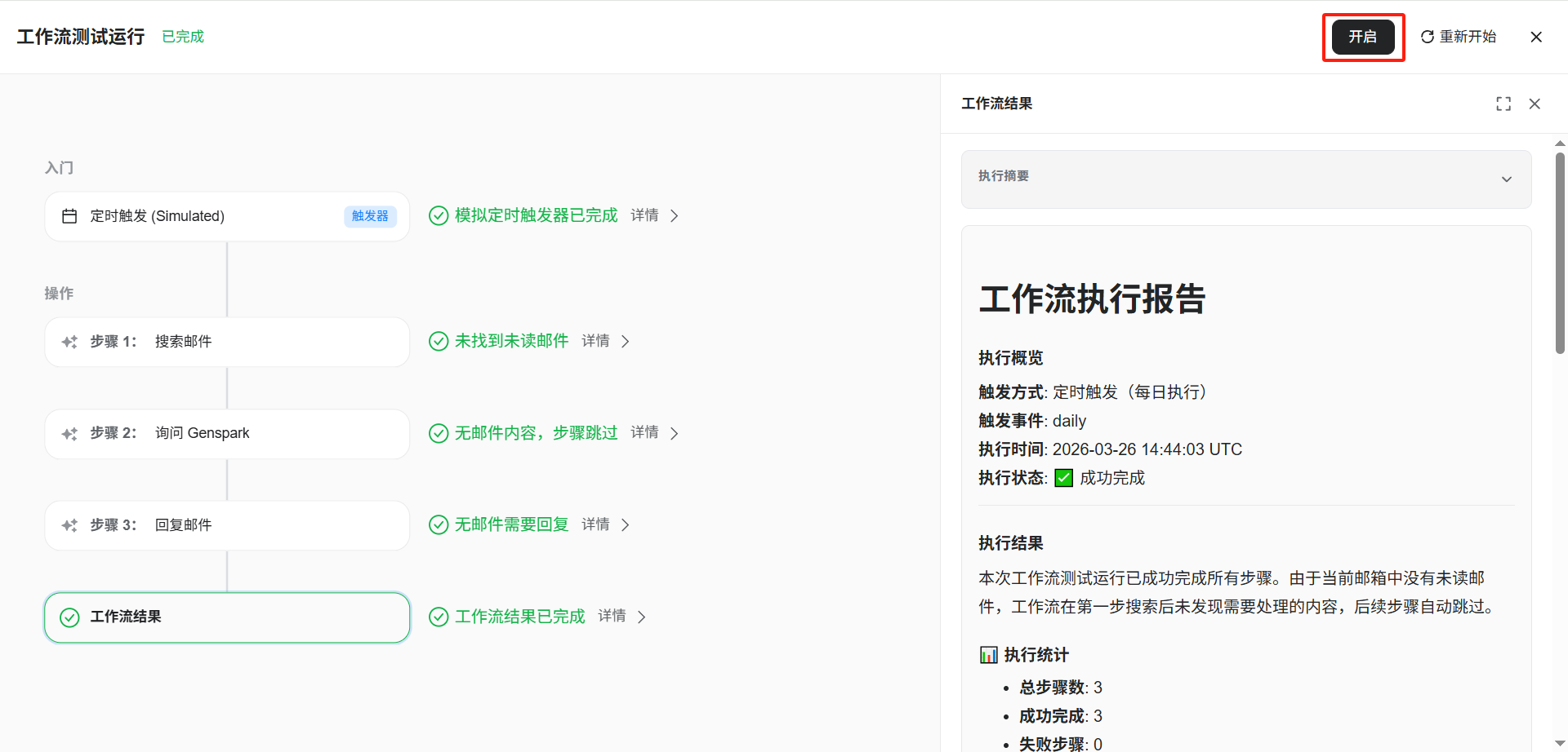 测试通过点击「开启」即可开启工作流。