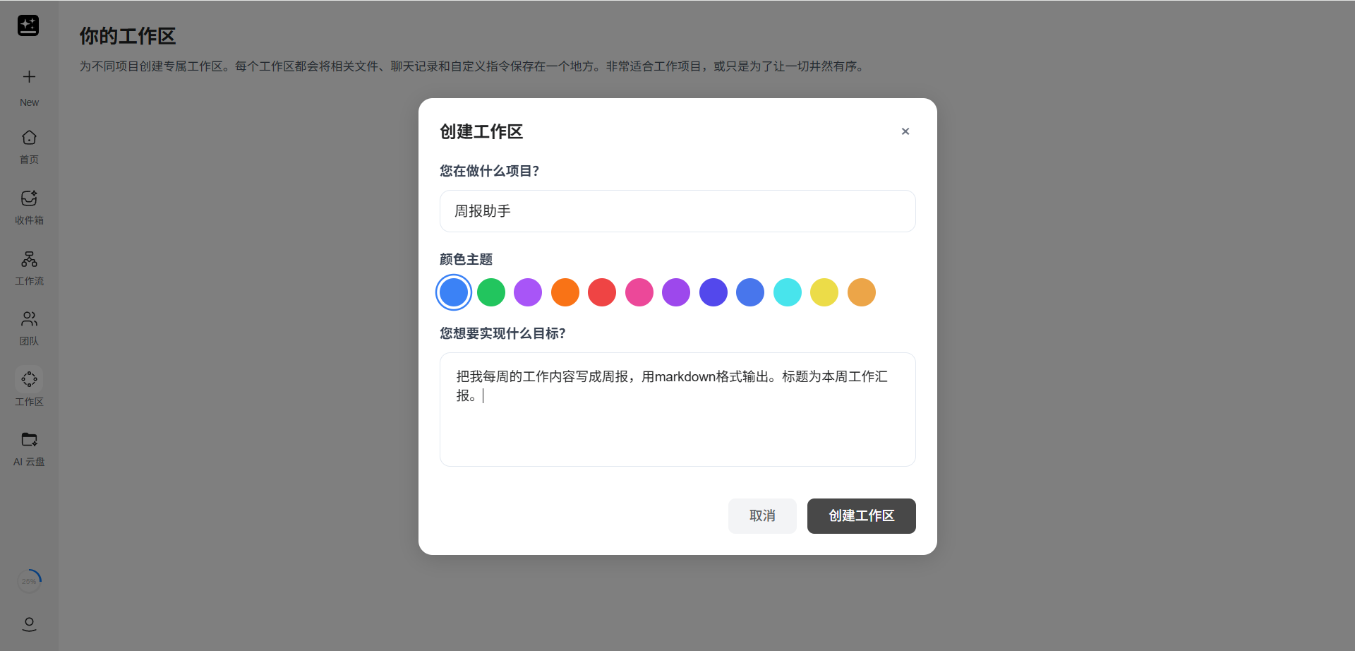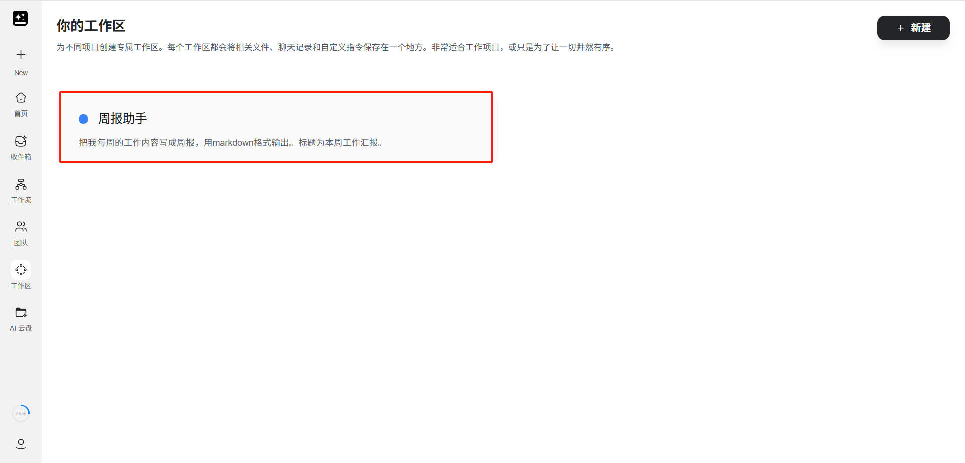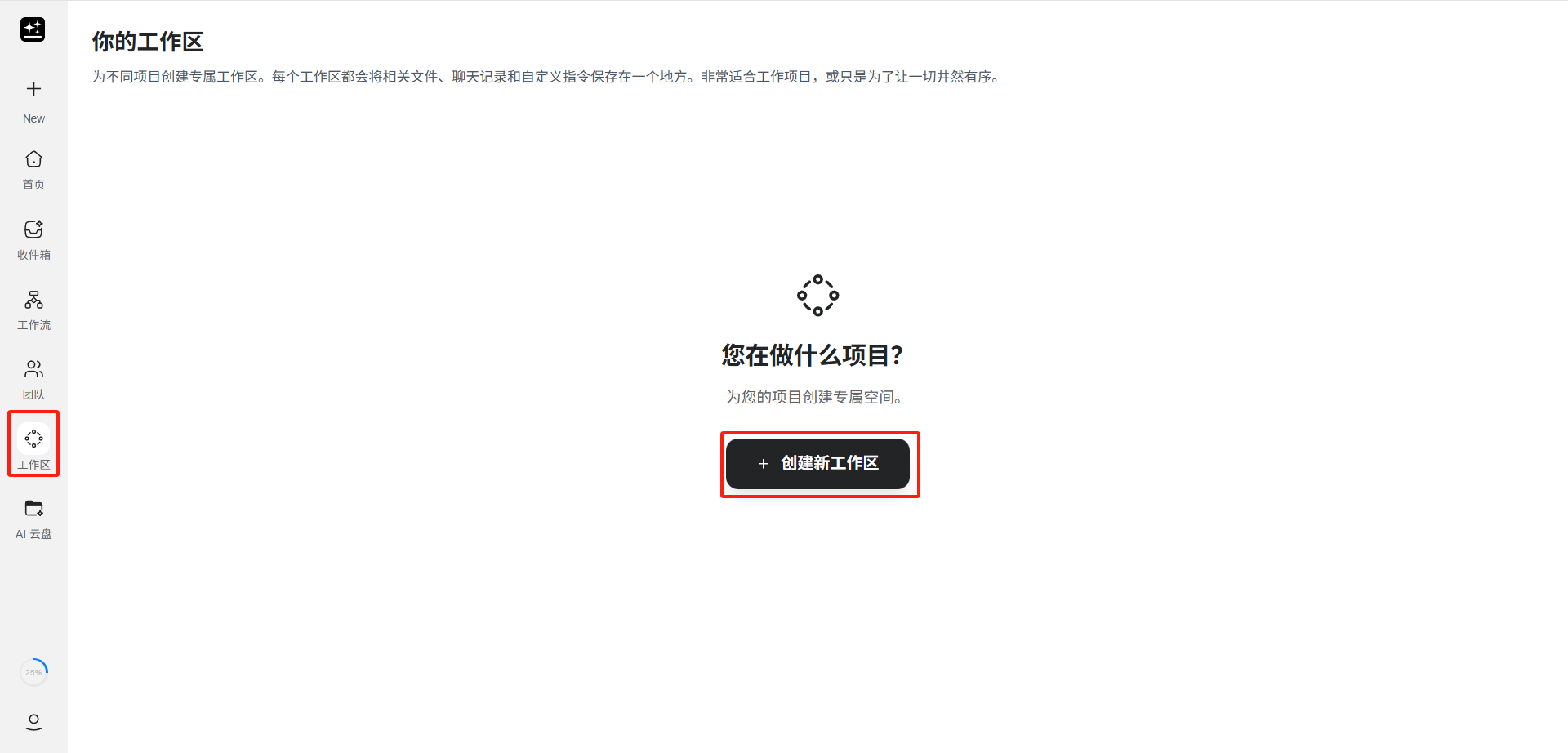点击左侧边栏「工作区」>「创建新工作区」。