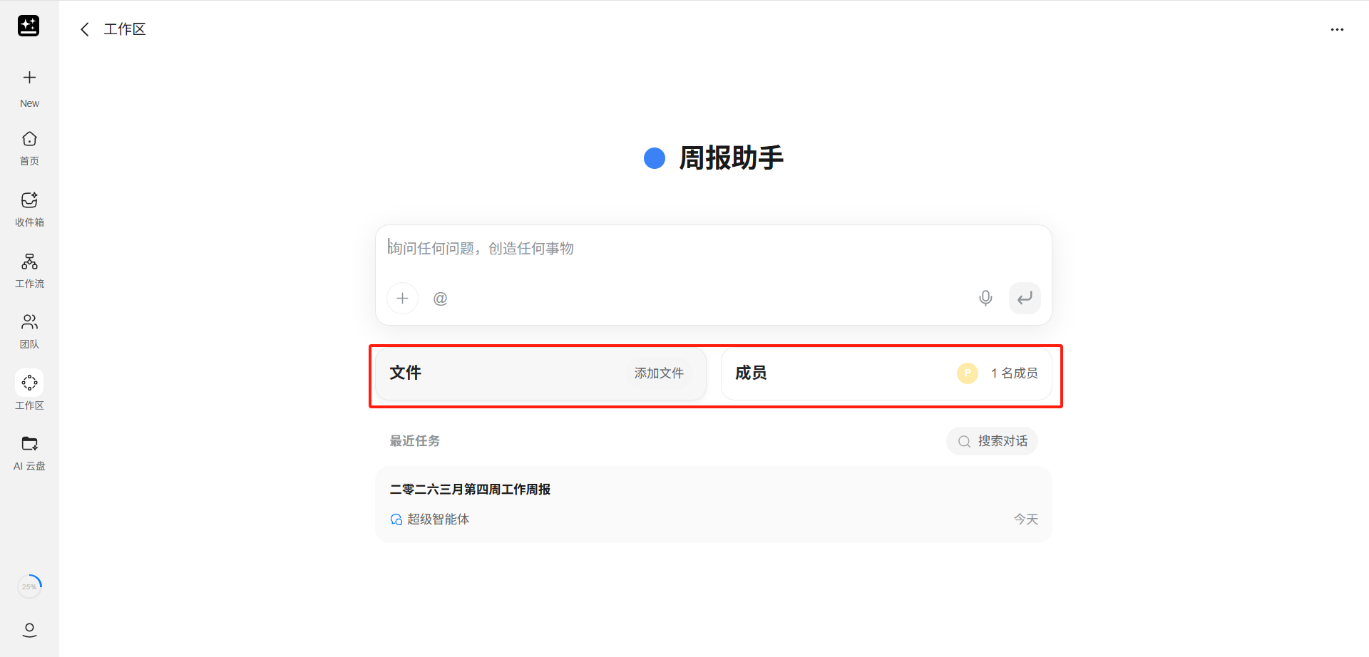 创建好的工作区可以上传参考文件,还可以邀请其他成员加入工作区。在工作区的对话都将使用相同的指令和参考文件,避免用户重复输入。