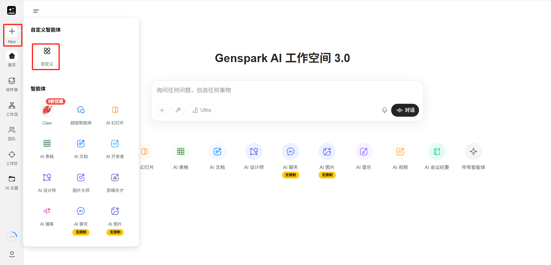 在 Genspark 主页点击「自定义智能体」或从侧边栏「+ 新建」进入。