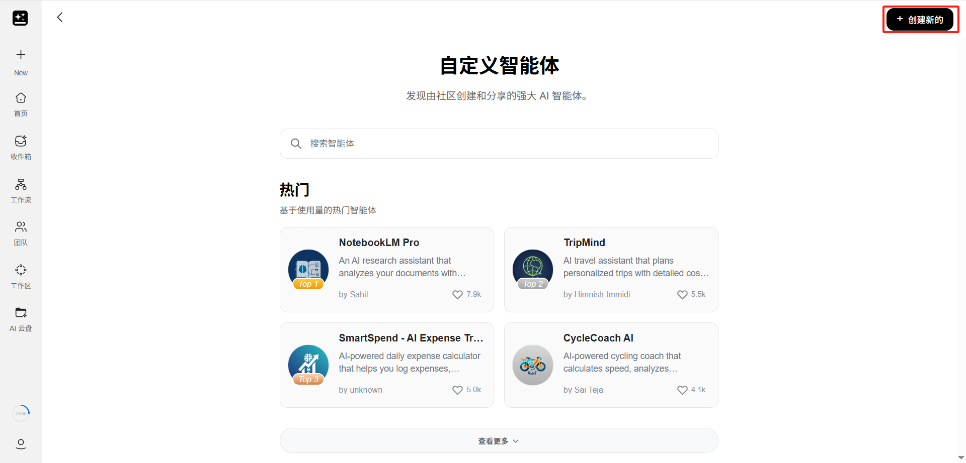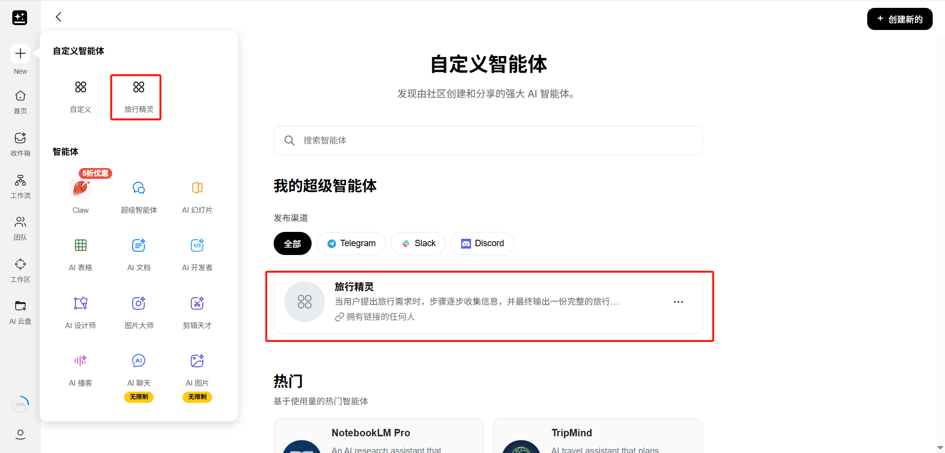 自定义智能体让用户可以用一句话创建专属的 AI 助手,为特定场景、特定需求量身定制。创建后可以通过在超级智能体对话中输入 @ 符号来随时调用,也可以发布到自定义智能体商店与全球用户分享。
