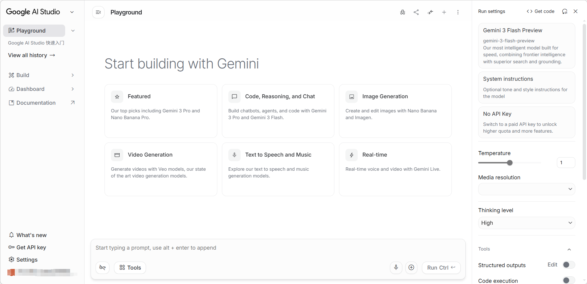 进入 Google AI Studio 后,默认停留在「Playground(游乐场)」界面。在页面中央下方的输入框中输入问题,点击「Run Ctrl ←(运行)」按钮或按快捷键 Ctrl + Enter 发送。