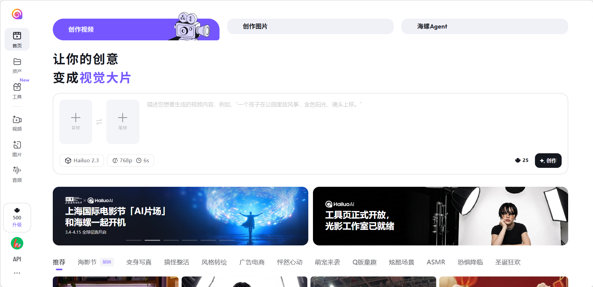 首页顶部有三个标签切换按钮:「创作视频」、「创作图片」、「海螺Agent」,分别对应三大主要创作模式,点击即可快速跳转。