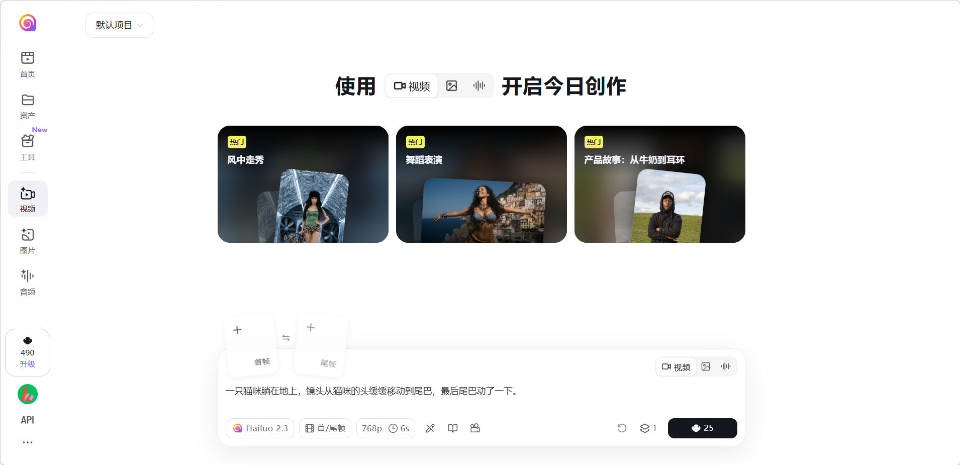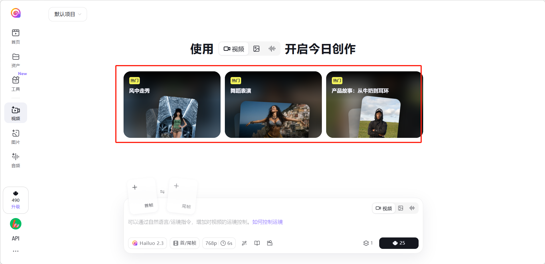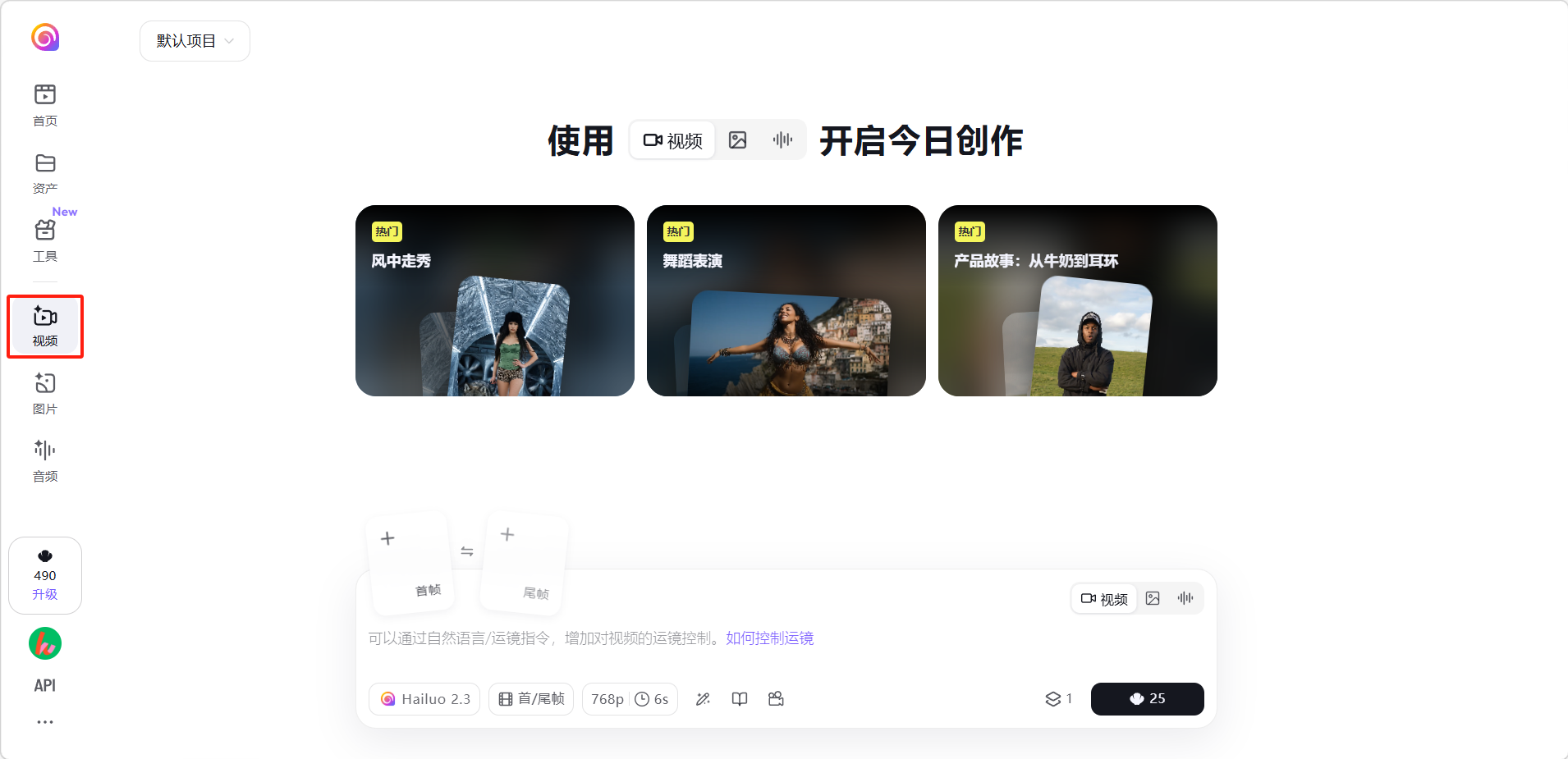 点击左侧导航「视频」,进入专属视频创作页面。工具页面和首页也可以进行视频创作,是同一个入口。