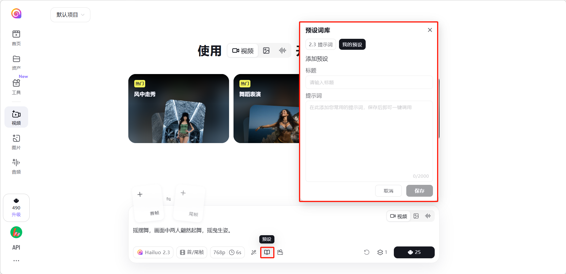 输入框下方的书本图标可以设置预设的提示词,方便以后使用。还可以选择官方的预设图片作为参考图(可选)。