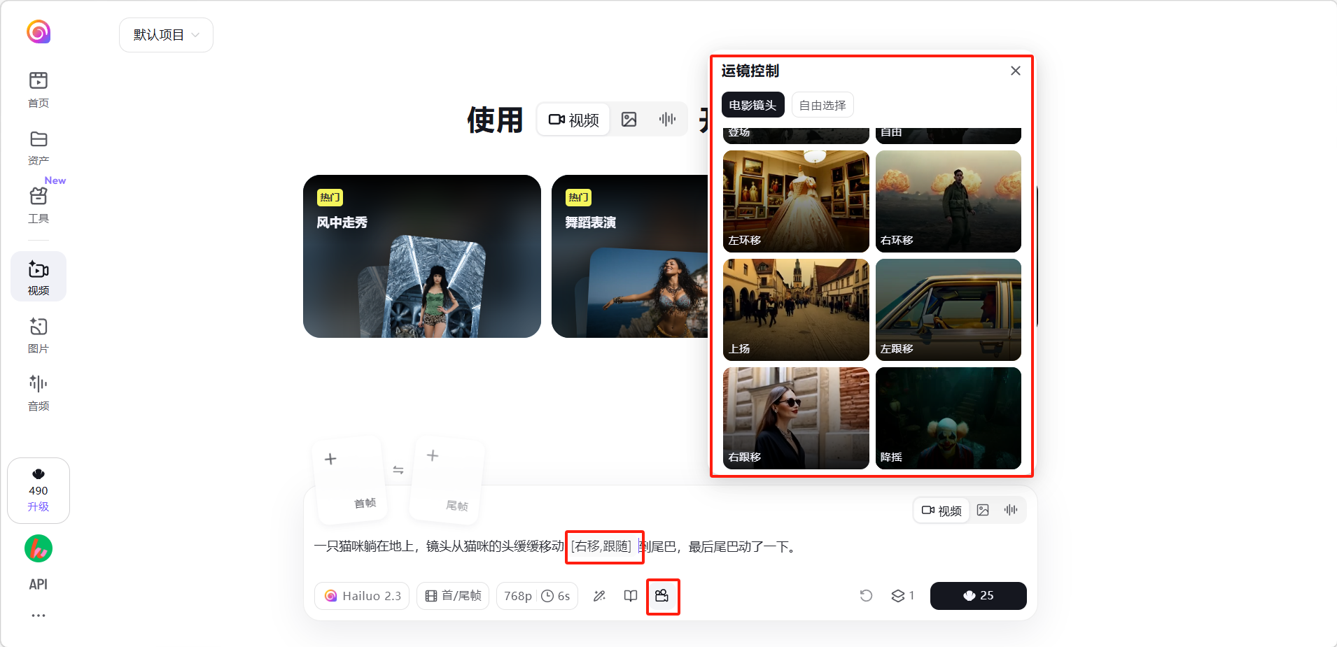 点击输入框下方的摄像机图标可以在光标的位置插入预设好的镜头指令(可选)。