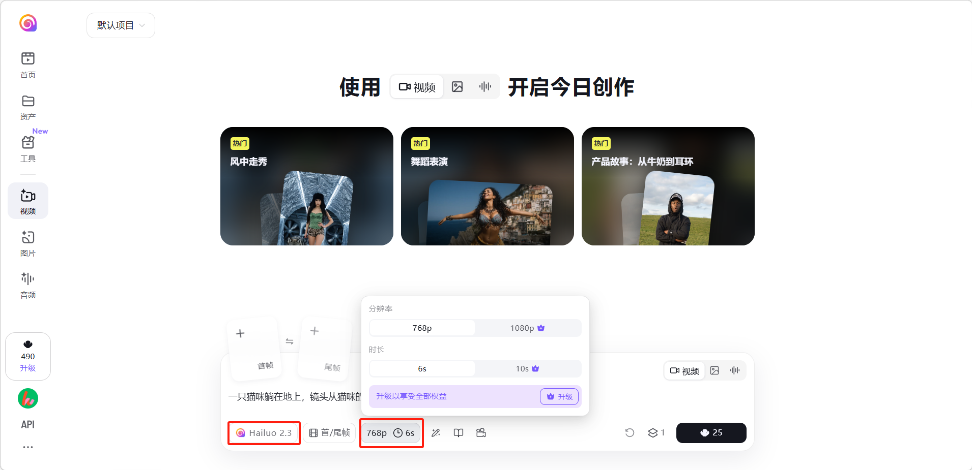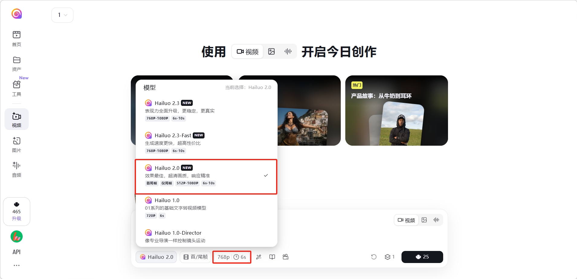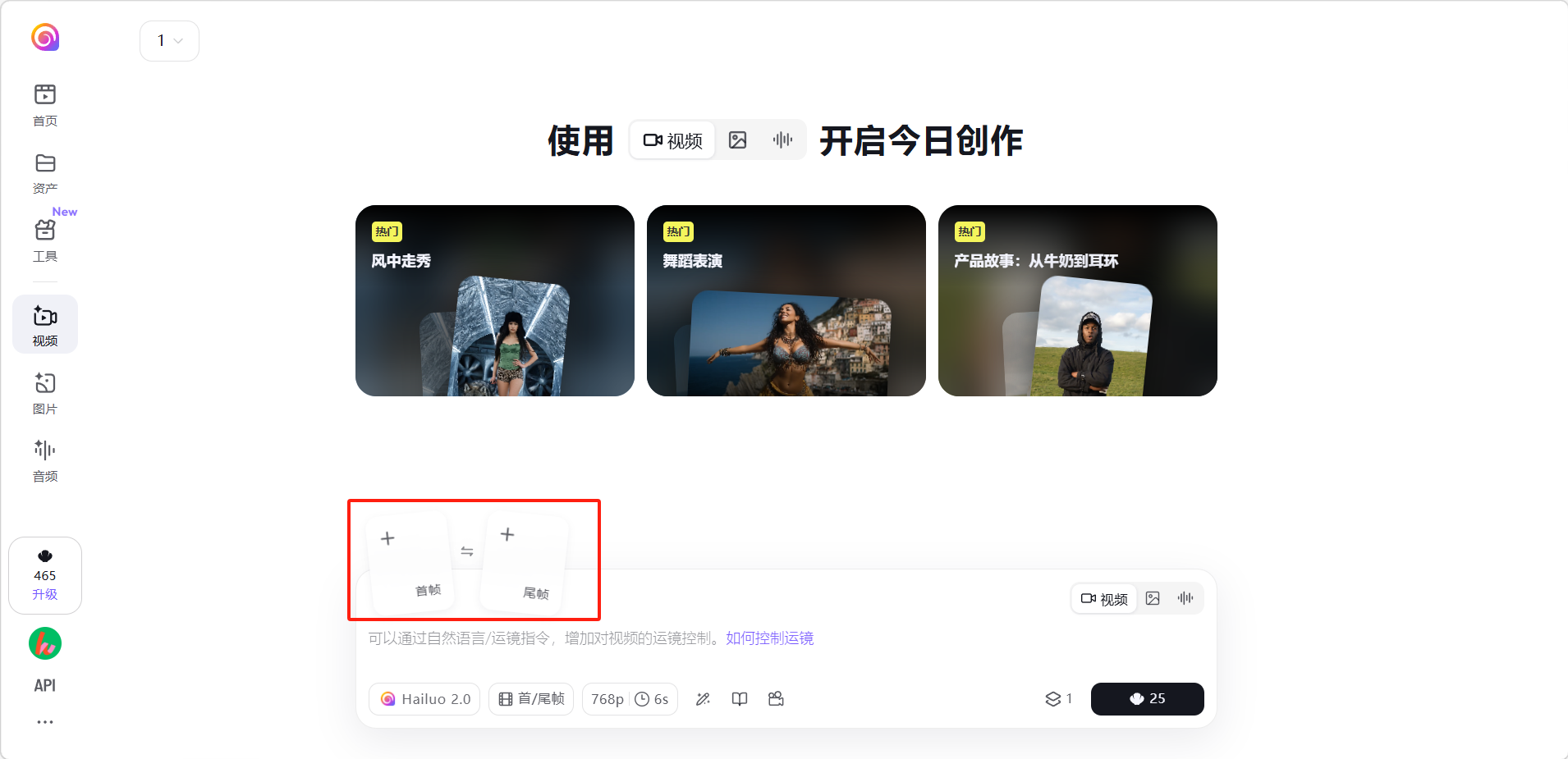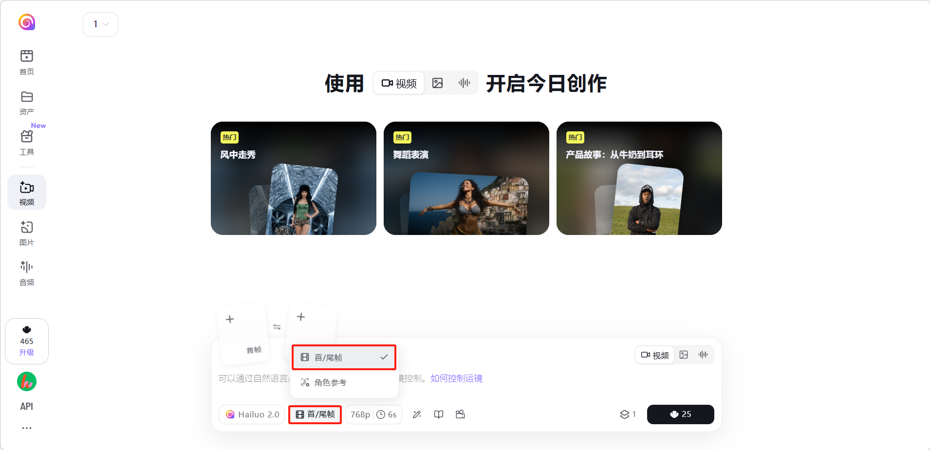 选择支持生成首尾帧视频的模型,设置好视频参数即可生成。