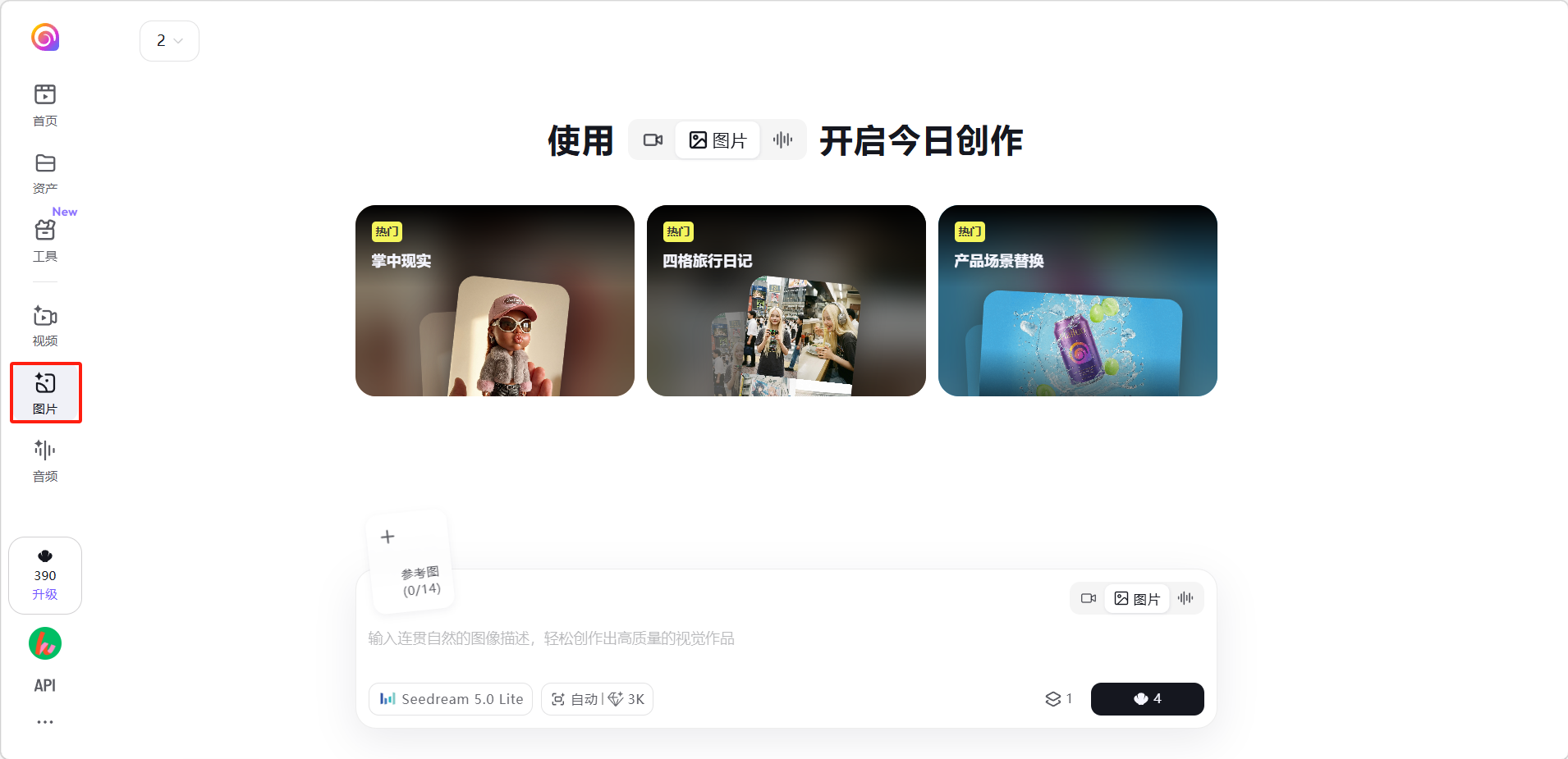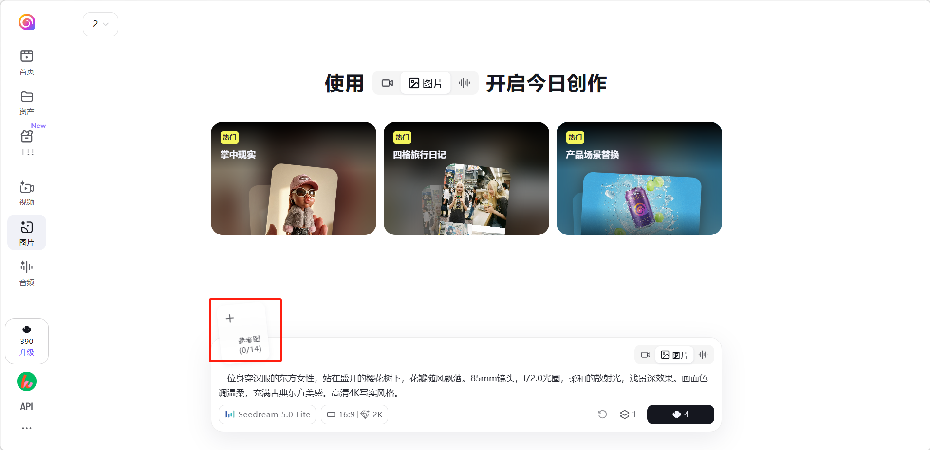 在输入框中输入图片描述,支持添加参考图(最多14张)。