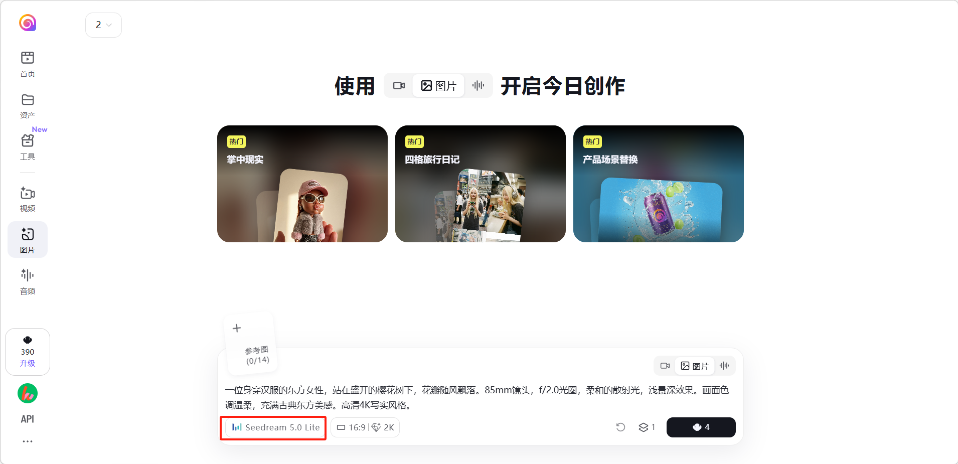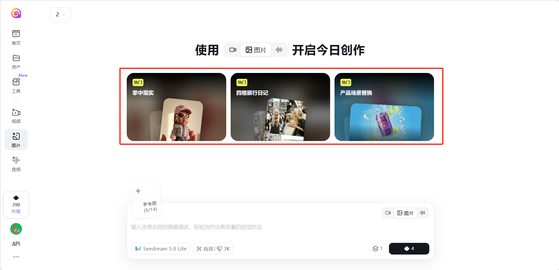 与视频创作不同,图片创作的优势在于能够快速批量生产高质量视觉内容,适合用于社交媒体配图、产品展示、概念设计稿、AI绘画创作等多种场景。平台提供的模板库涵盖了「掌中现实」、「四格旅行日记」、「产品场景替换」等热门创作玩法,即使是新手也能快速上手。