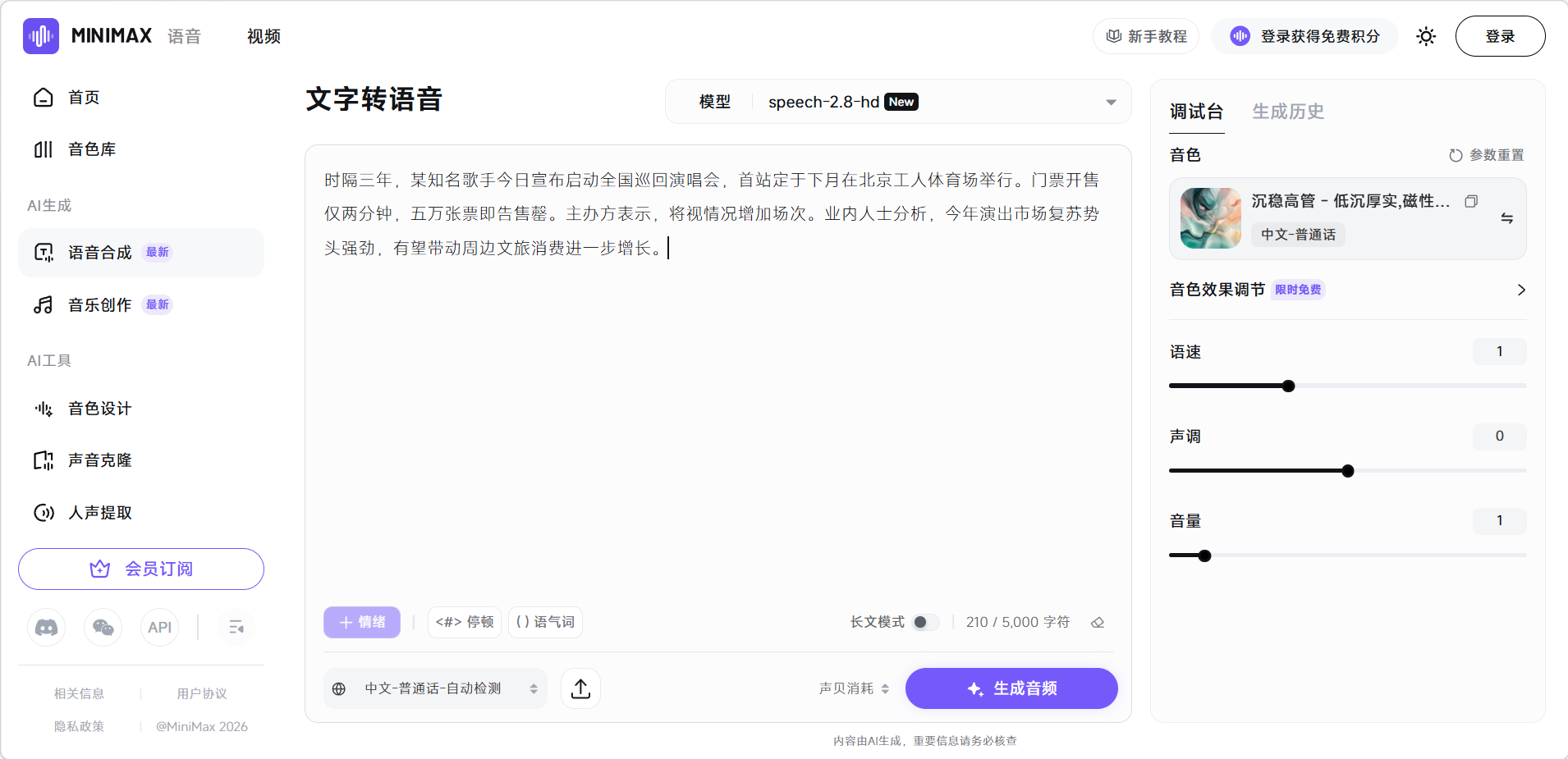 海螺AI的语音创作功能由 MiniMax Audio 提供技术支持,集成了 MiniMax Speech 2.8-hd 高清语音合成模型与 Music-2.5+ 音乐创作模型。整个语音模块分为两大板块:AI生成(语音合成、音乐创作)和AI工具(音色设计、声音克隆、人声提取),五大功能覆盖从内容创作到音频处理的完整链路。