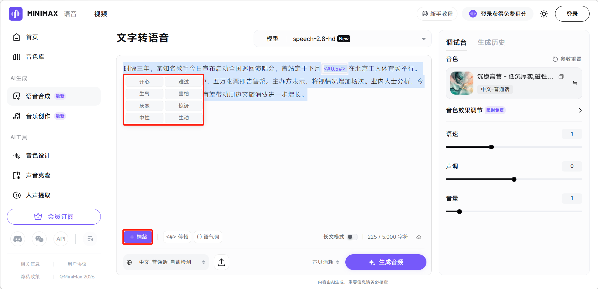 将文字输入后,选择喜欢的音色,一键生成高质量语音。支持在文字中插入「情绪标签」(如[开心]、[悲伤]、[惊讶])、「停顿标签」(如<#1.0#>表示停顿1秒)和「语气词标签」(如[嗯]、[哦]),实现对语音情感和节奏的精细控制。