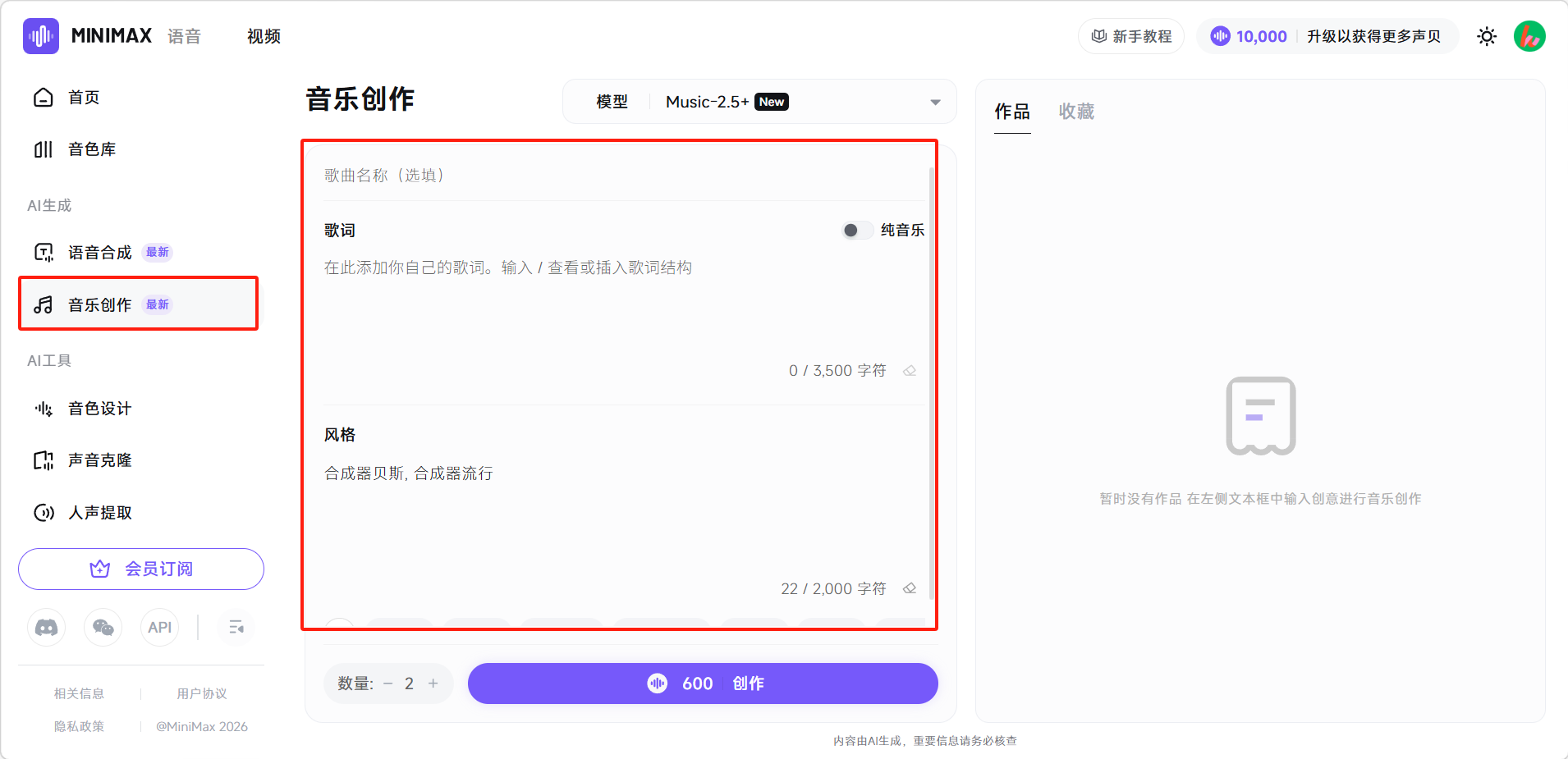 点击左侧「音乐创作」进入创作界面,填写歌曲名(可选填),完整歌词(最多3500字符)和音乐风格。