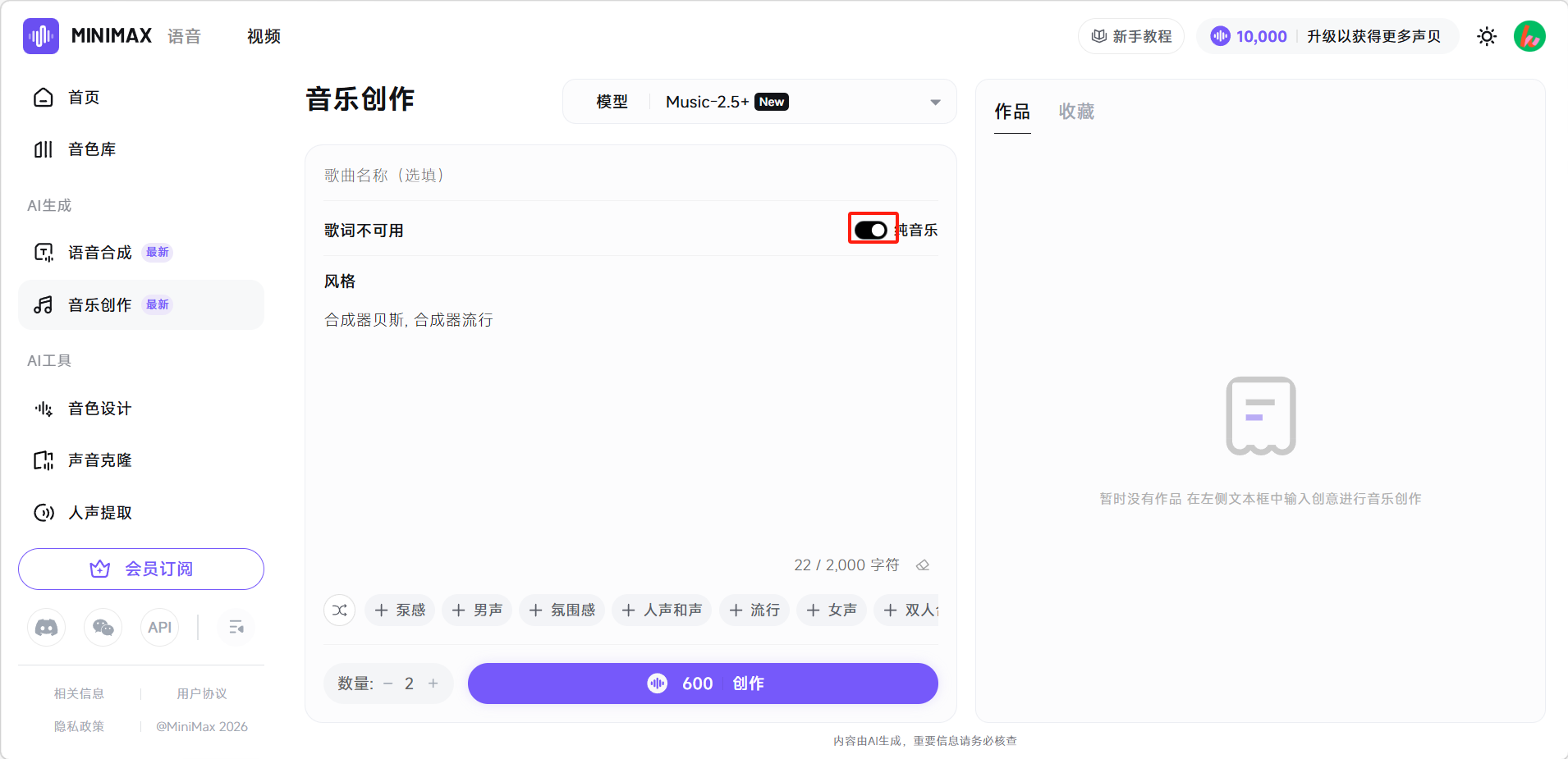 - 风格描述越具体,效果越好:不要只写"流行音乐",而是写"抒情流行,女声,钢琴+弦乐编曲,节拍偏慢,适合睡前聆听",这样AI对风格的把握会更准确。