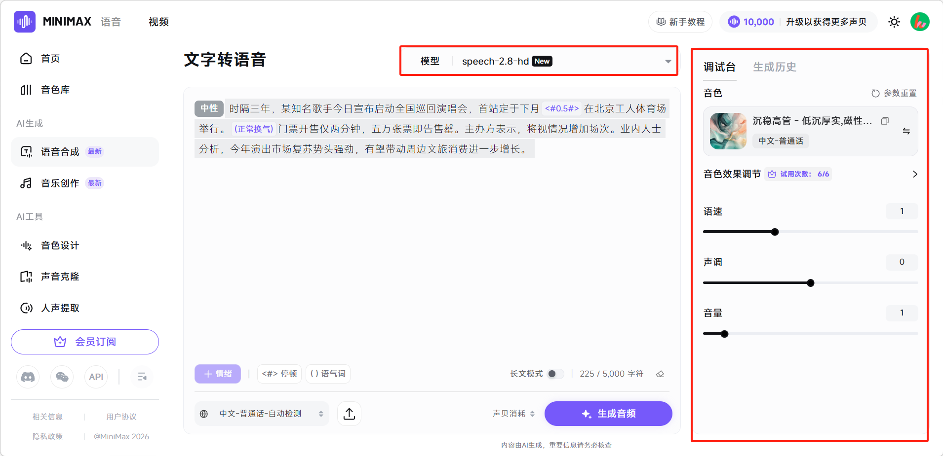 右侧边栏可以设置音色、语速、声调、音量。用户可以自行搭配。最后选择模型,设置成完成后点击「生成音频」即可。