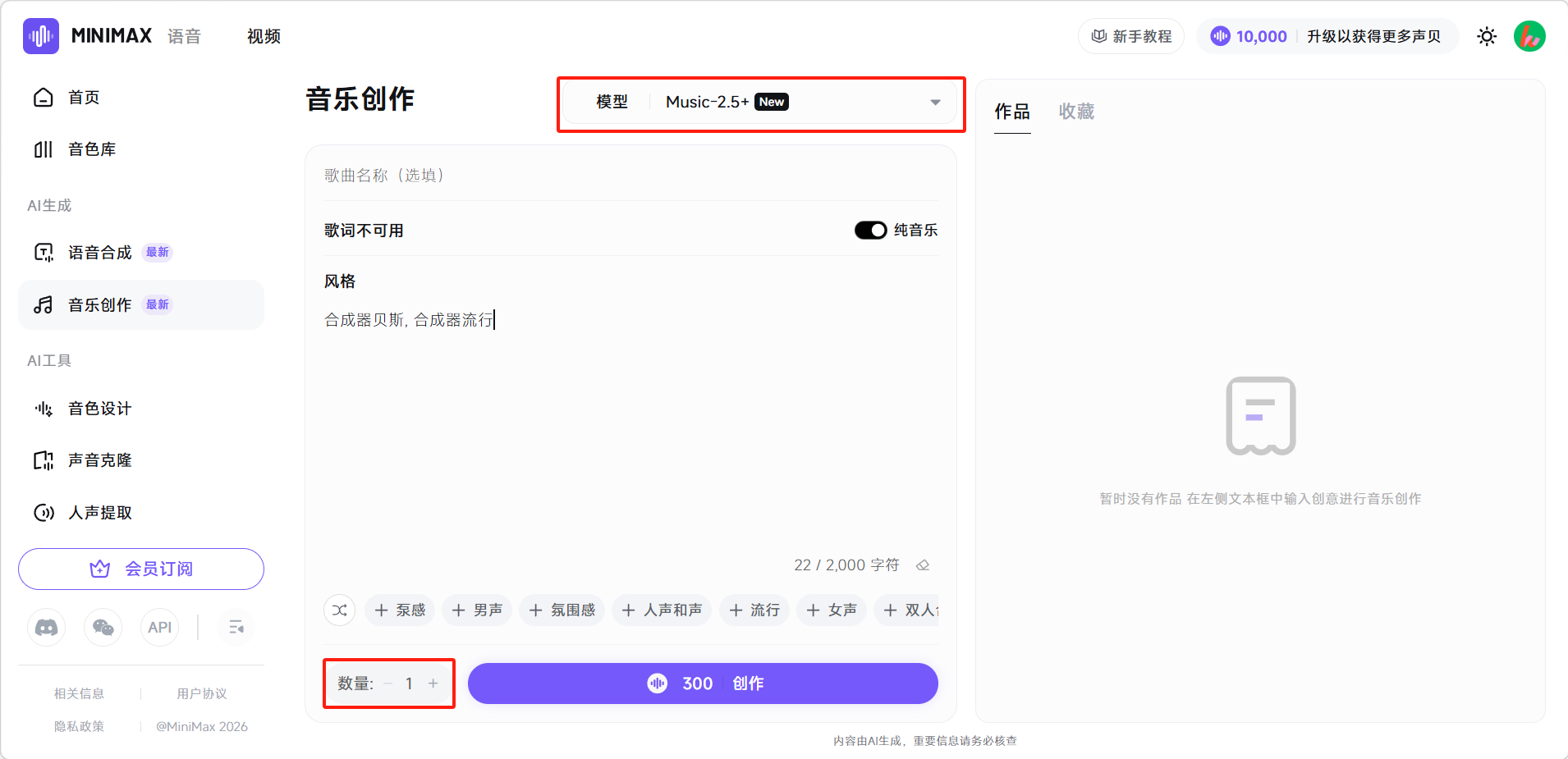 设置生成数量后,选择创作模型。点击「创作」按钮即可。