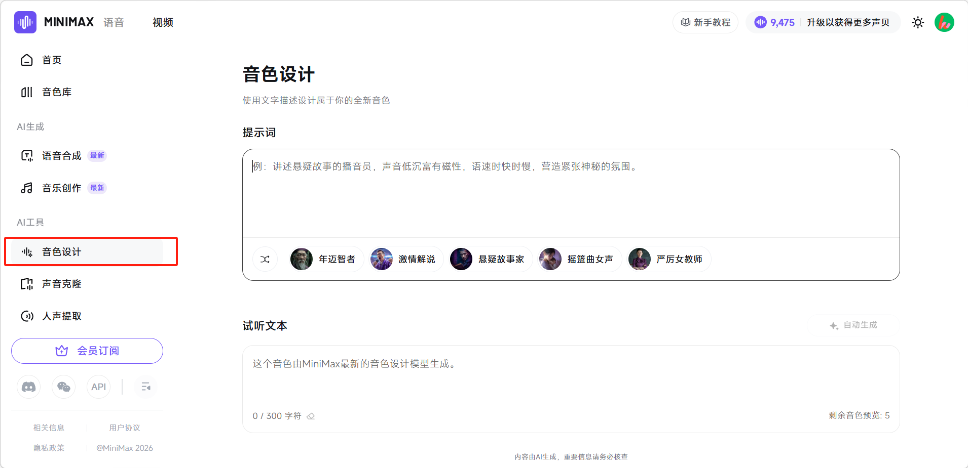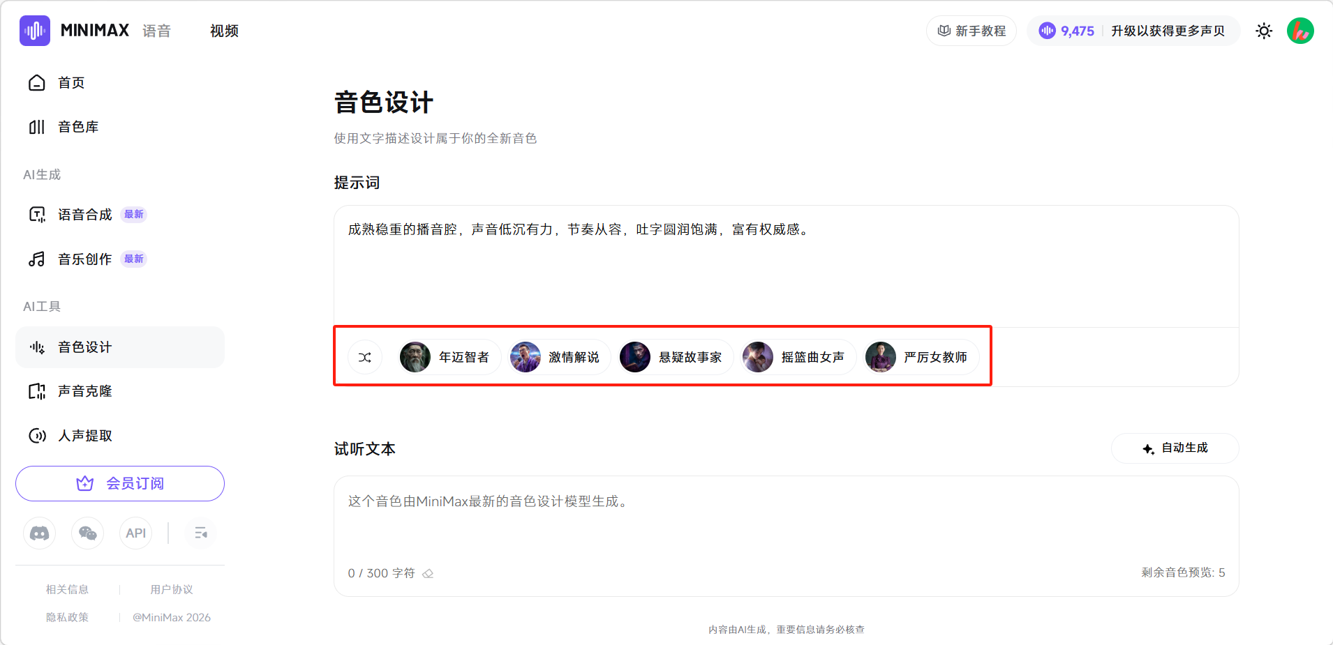 描述想要的音色或选择下方预设的模板。然后点击「自动生成」。
