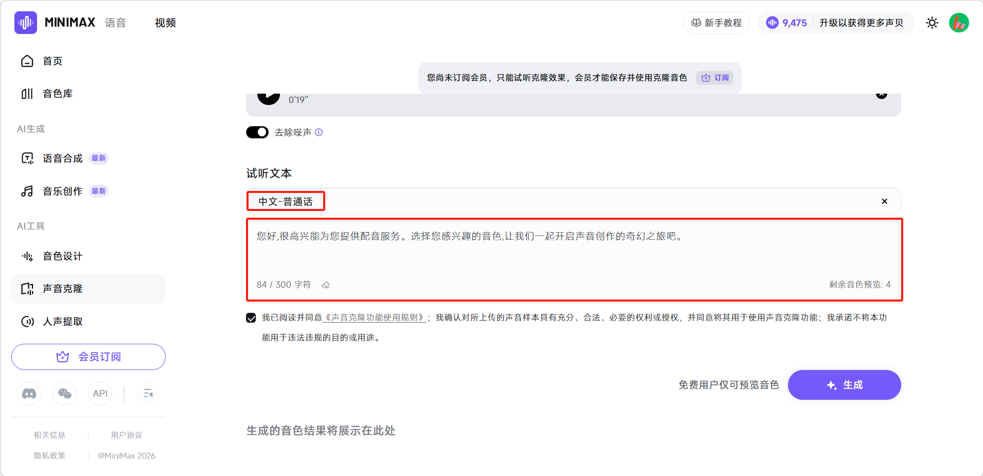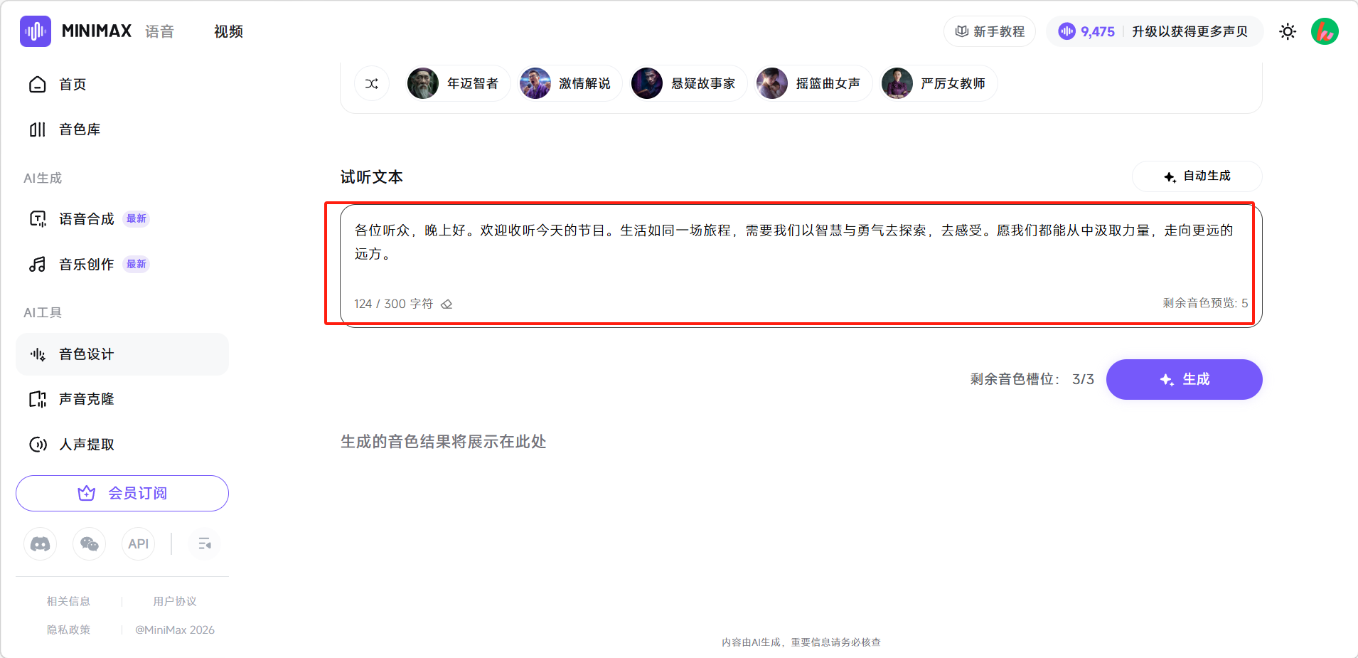 自动生成完成后在「试听文本」输入框会生成一段试听文本,点击下方「生成」即可试听。