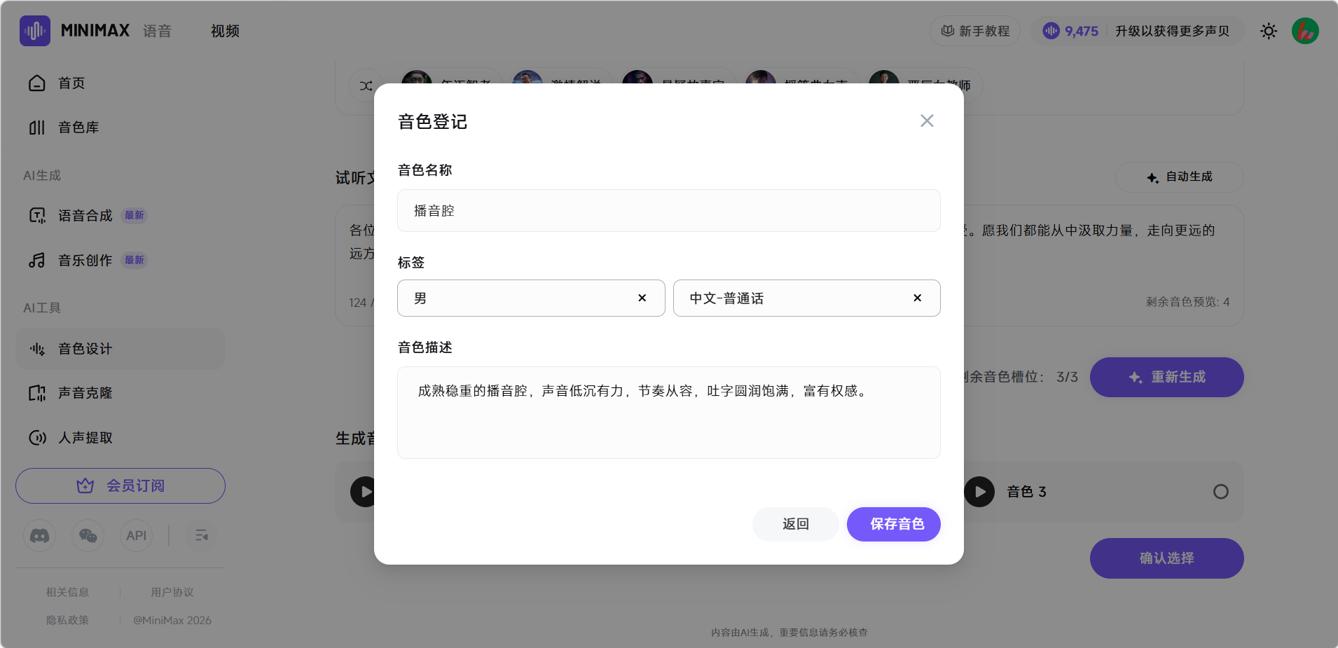 设置音色的名称,性别,和语言。点击「保存音色」即可。