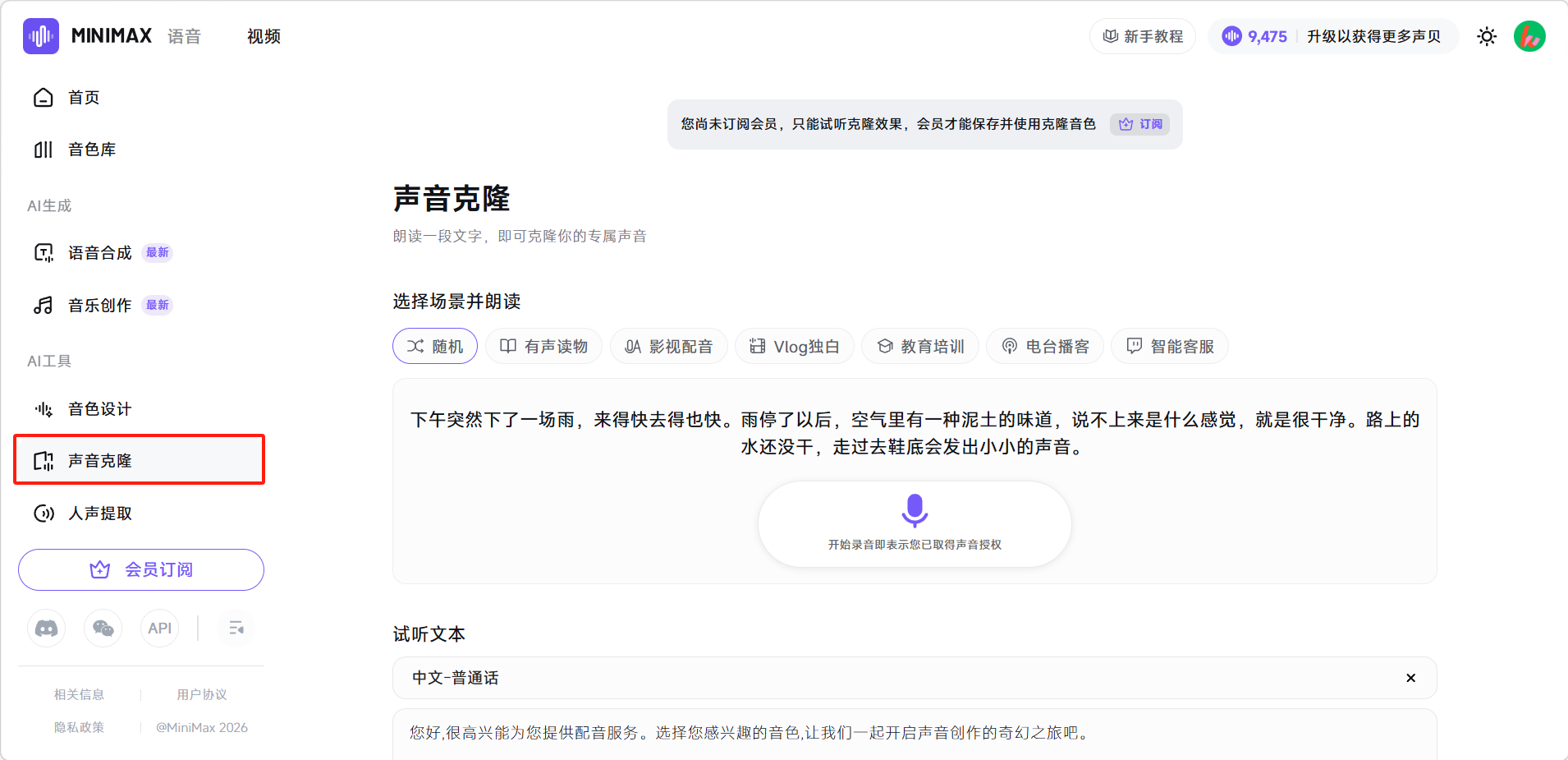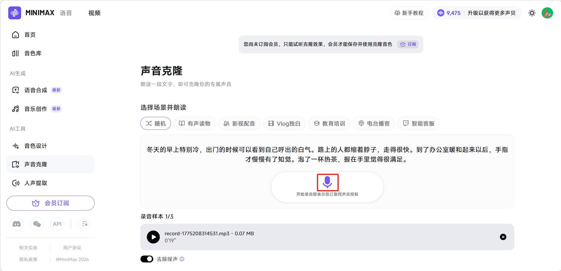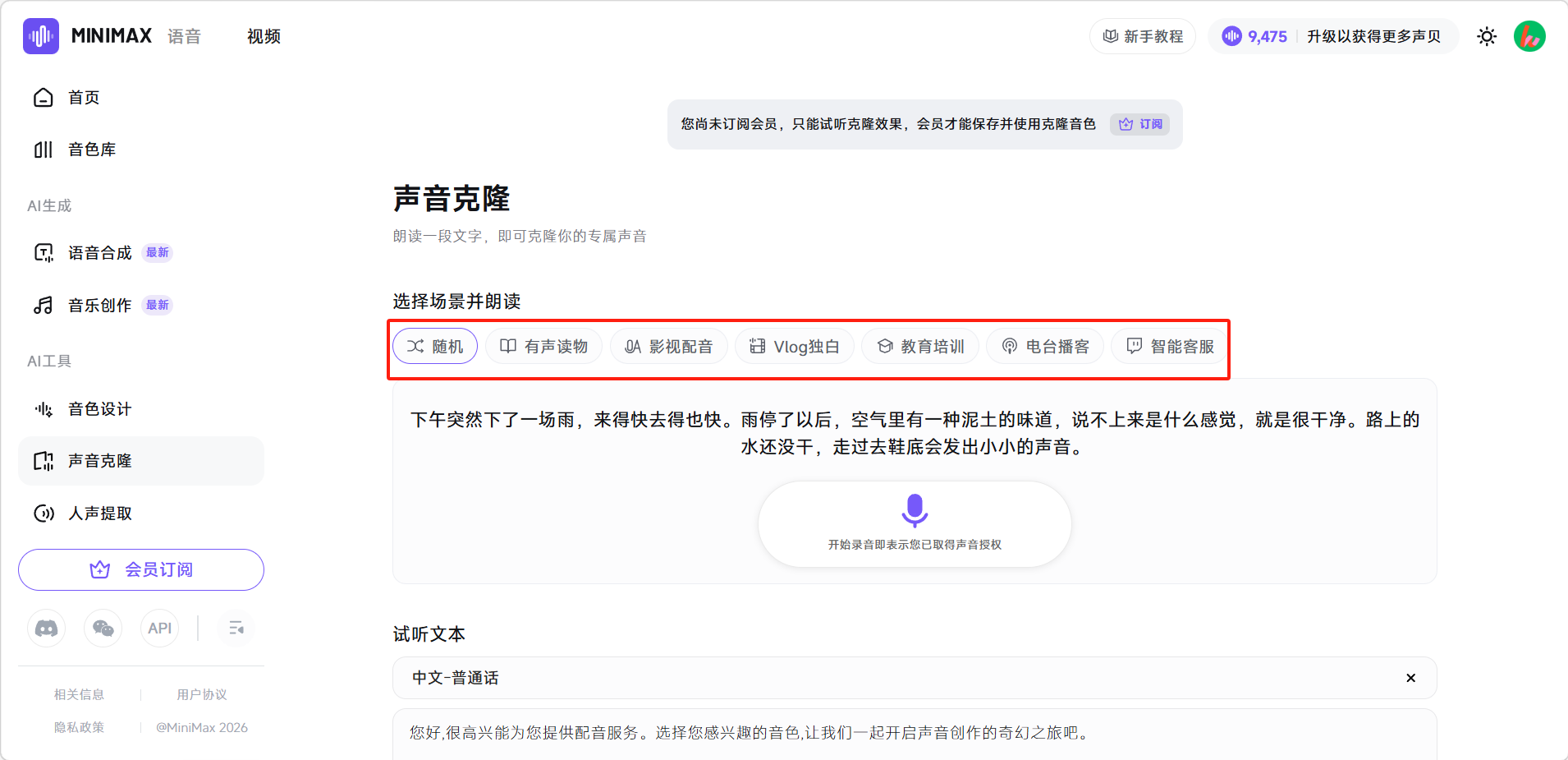 - 录制多个场景版本:平台提供多种朗读场景(如"新闻播报"、"情感旁白"等),建议选择与自己实际使用场景最接近的,克隆效果会更对口。