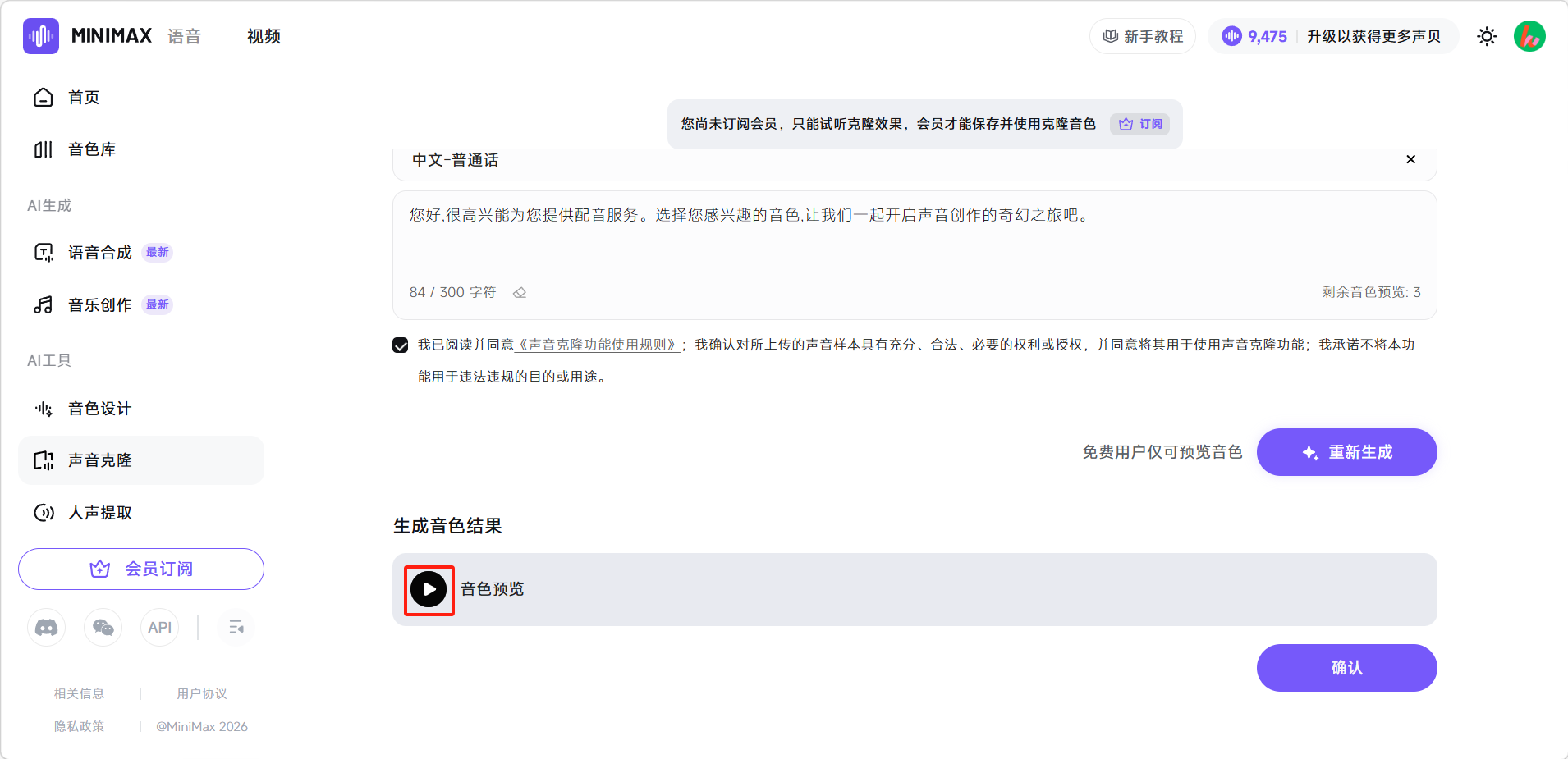 生成完成后点击播放键即可试听克隆的音色。没问题后点击右下角确认即可保存。