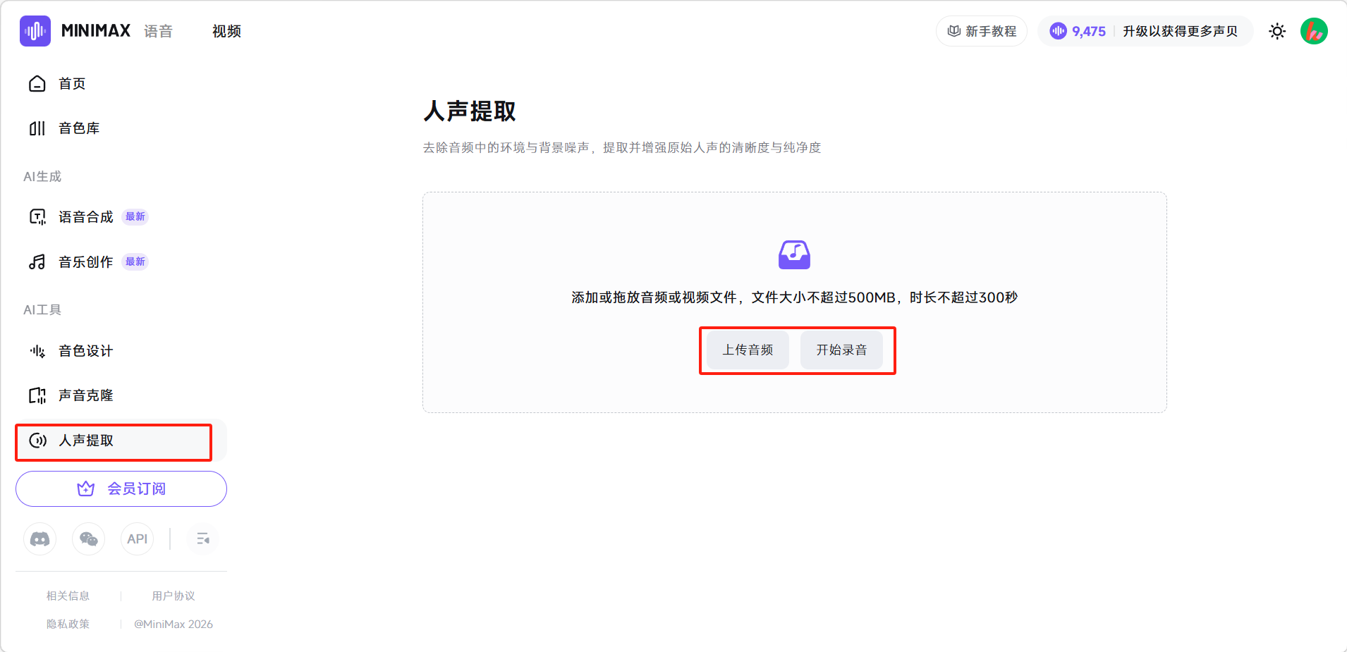 点击左侧边栏「人声提取」进入页面,点击「上传音频」或「开始录音」,添加需要处理的音频/视频文件。