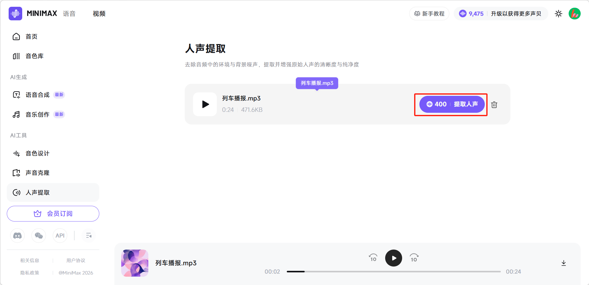 上传成功后点击「提取人声」。