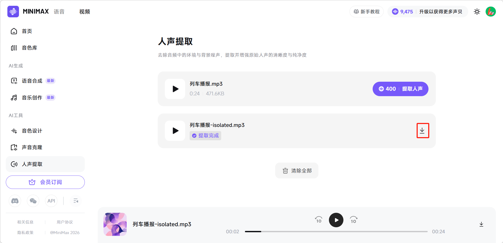 等待AI处理完成,下载提取后的干净人声文件即可。
