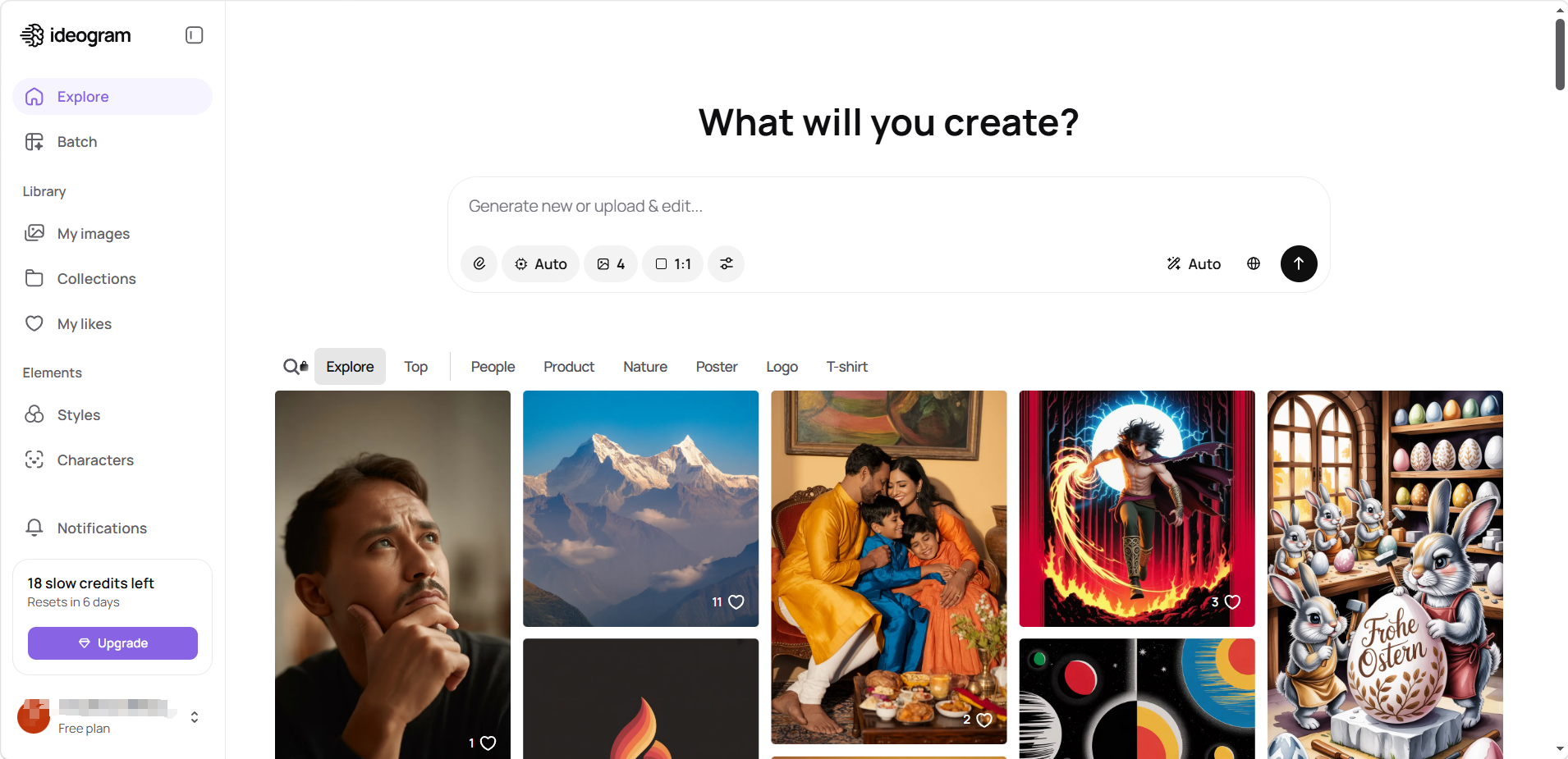 - 探索(Explore):Ideogram 社区公开图库,可浏览他人的优秀作品及其提示词