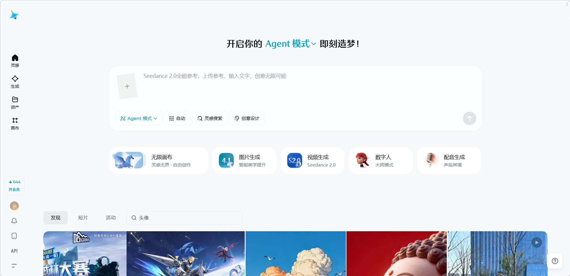 - 快捷入口:包括无限画布、图片生成、视频生成、数字人、配音生成五大功能的快速跳转卡片