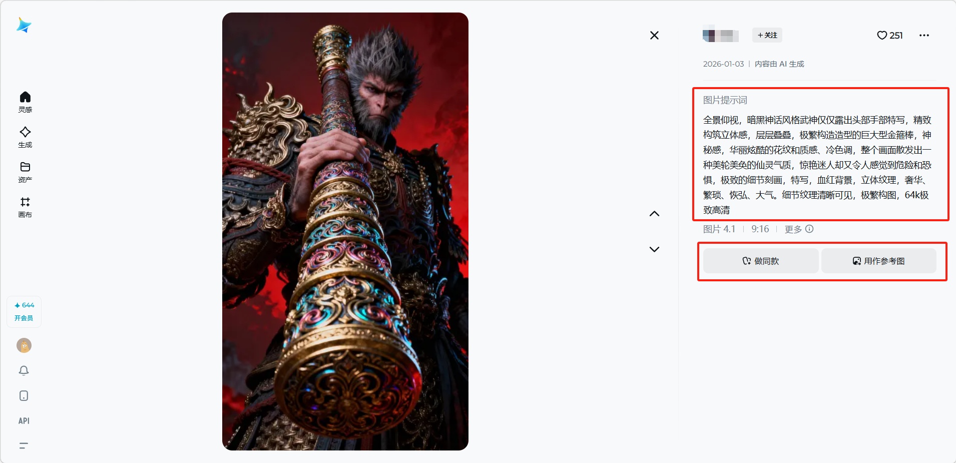 - 在灵感页面看到喜欢的作品时,可以直接查看该作品的提示词,点击「做同款」即可用相同的提示词进行创作
