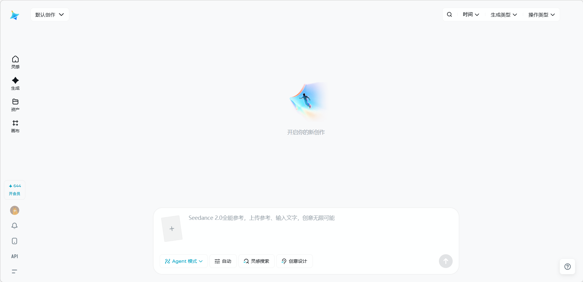 - 顶部左侧显示当前创作空间(如「默认创作」),支持按时间、生成类型、操作类型进行筛选