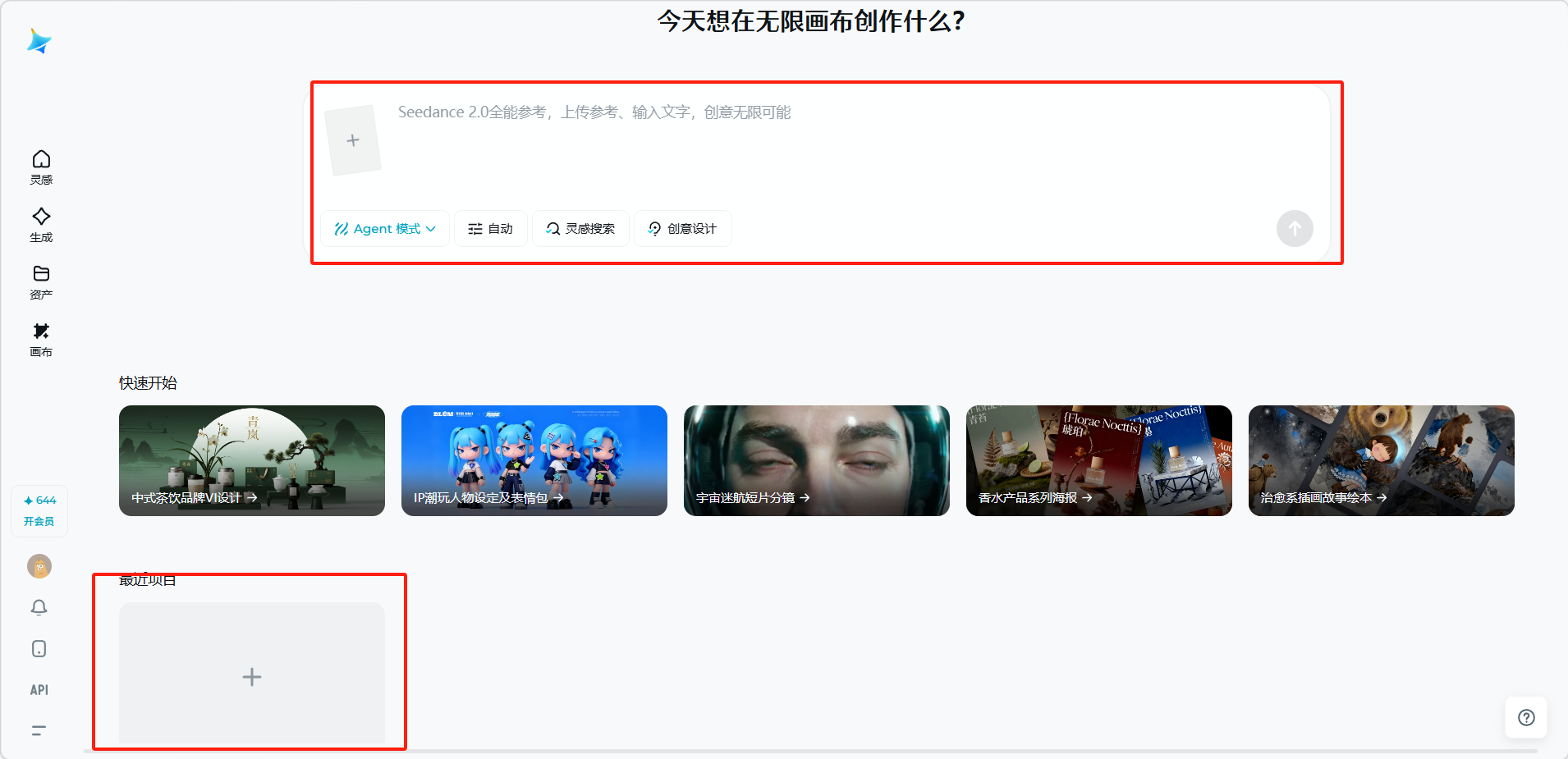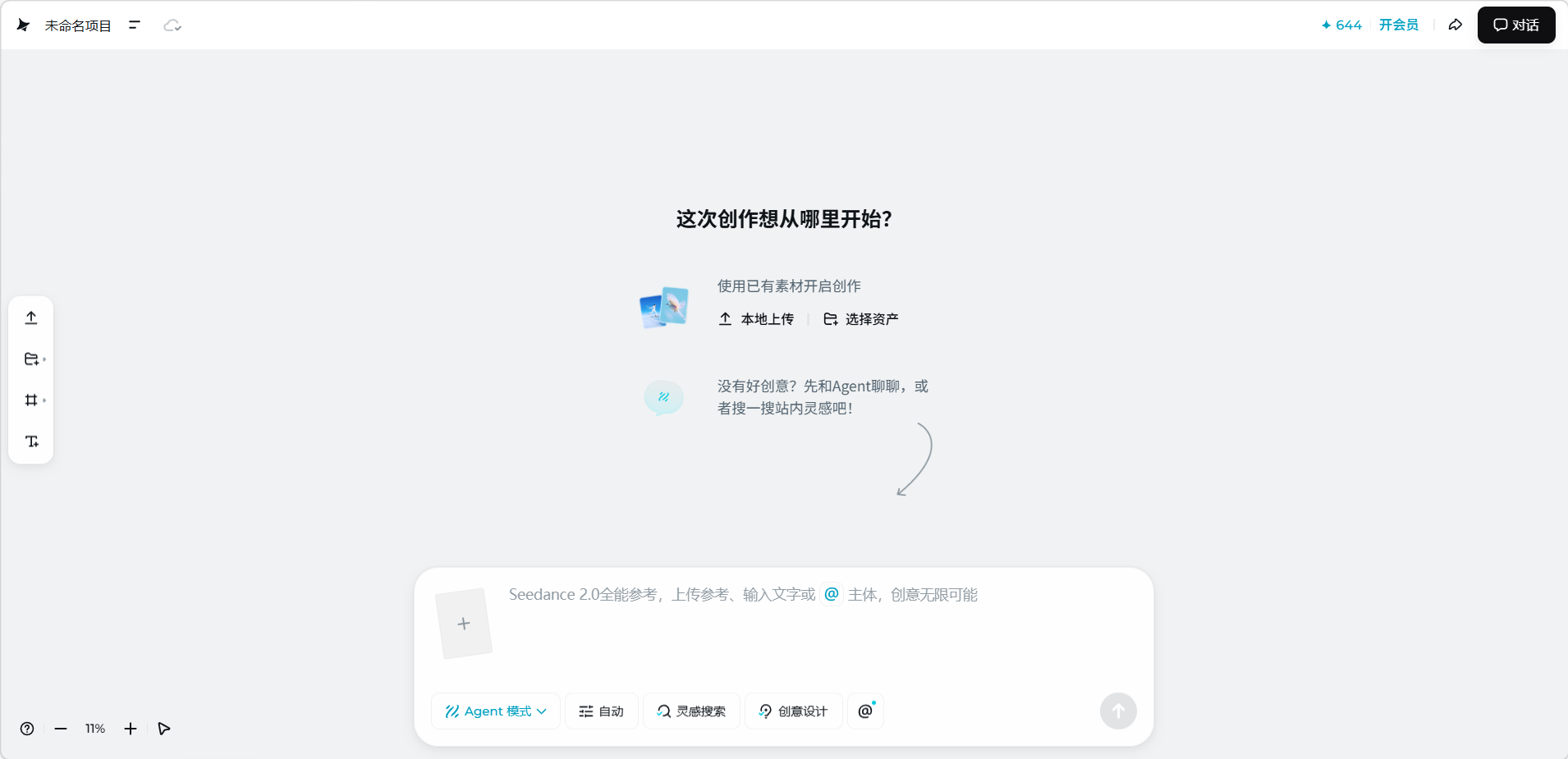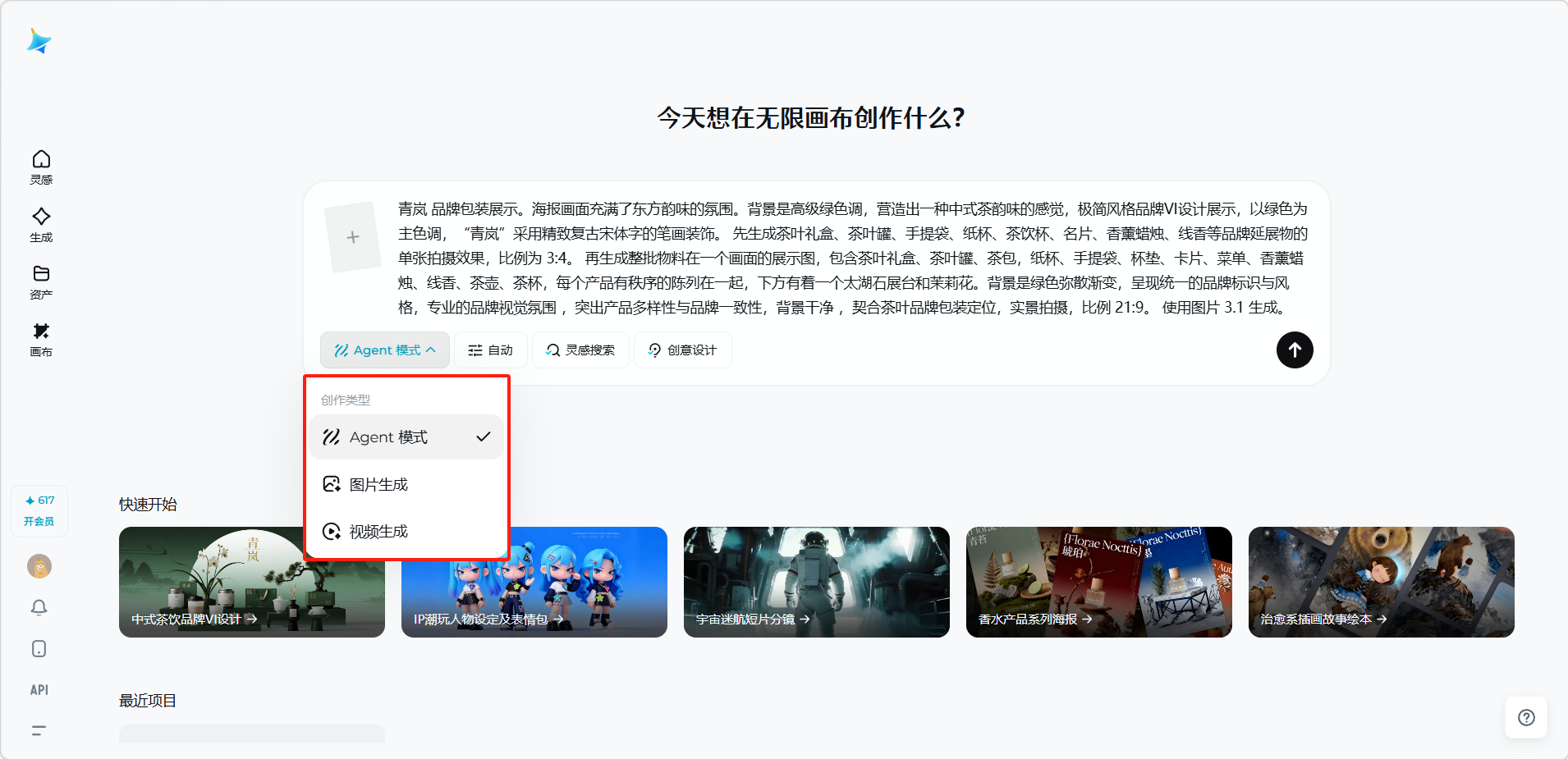 自由组织的无限空间。 画布没有固定的边界限制,你可以在上面随意放置图片、视频、文本等各种元素,通过拖拽和排布来组织自己的创意。Agent 模式下生成的内容会自动归入画板,不用手动整理。