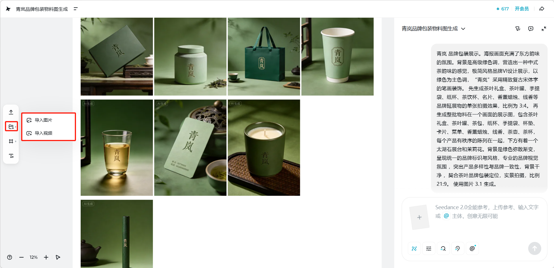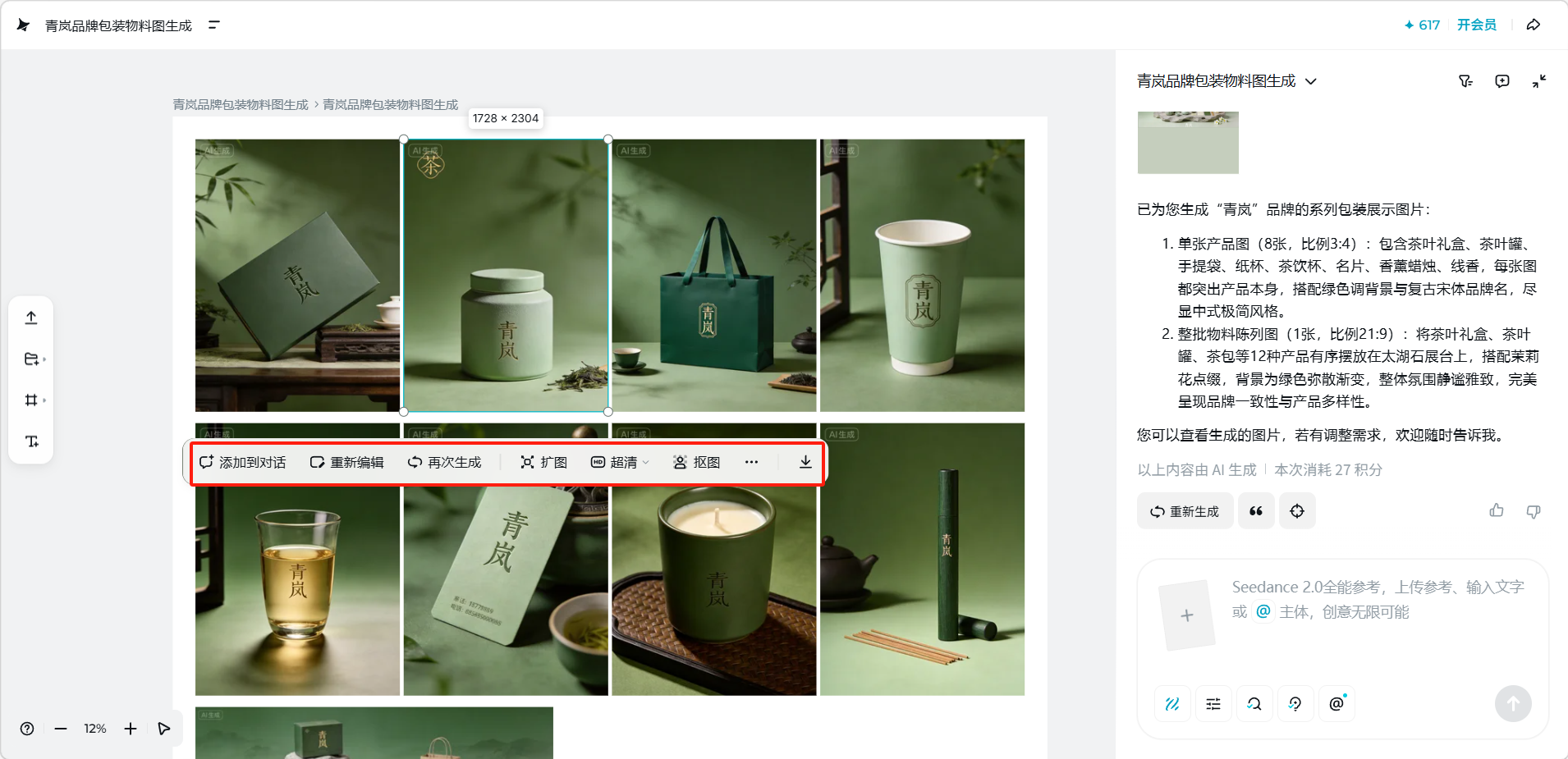 多种内容混合创作。 画布支持图片、视频、文字等不同类型素材的混合编辑。你可以选中画布上的图片直接对话让 AI 重绘,也可以批量抠图、超清放大,甚至框选多张图一键生成视频。创作方式既可以通过 Agent 对话驱动,也可以从侧边栏手动添加内容。