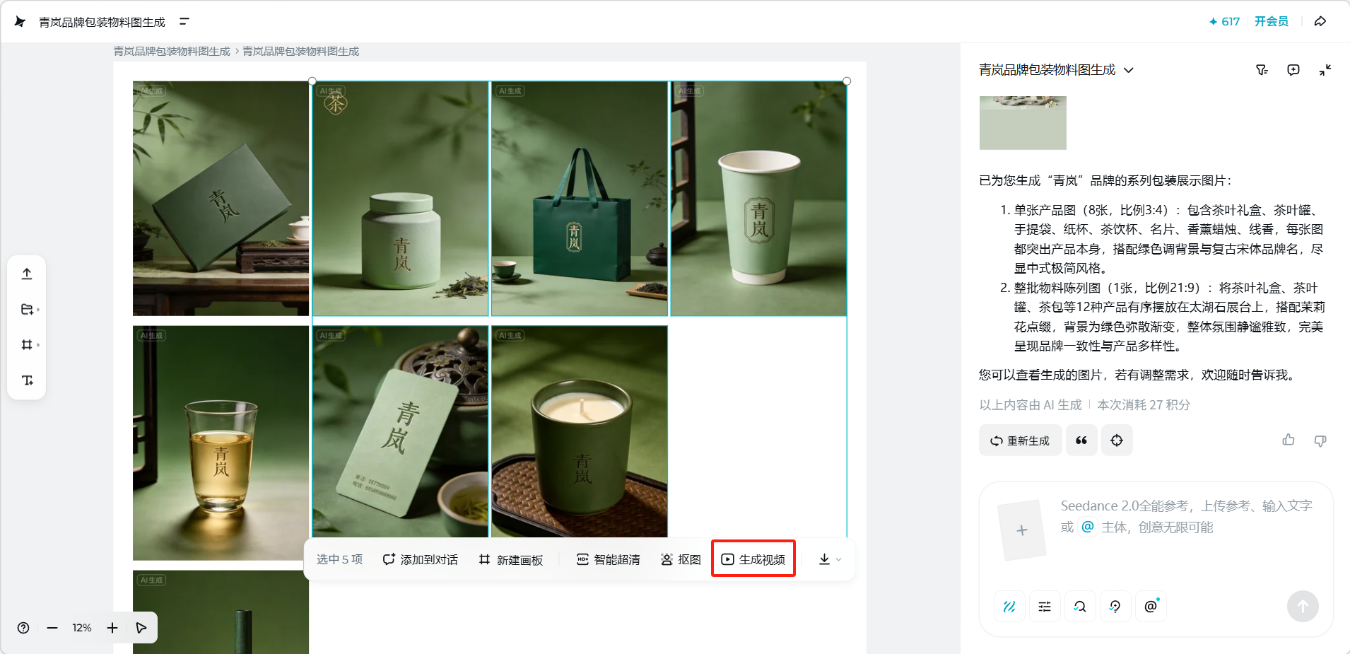 编辑与加工: 选中画布上的单张图片后,可以通过对话让 AI 进行重绘、修改等操作。选中多张图片后点击「生成视频」,图片会自动填入输入框,再描述想要的视频效果即可。生成的视频还支持 AI 配乐、音效、补帧和提升分辨率等后期处理。