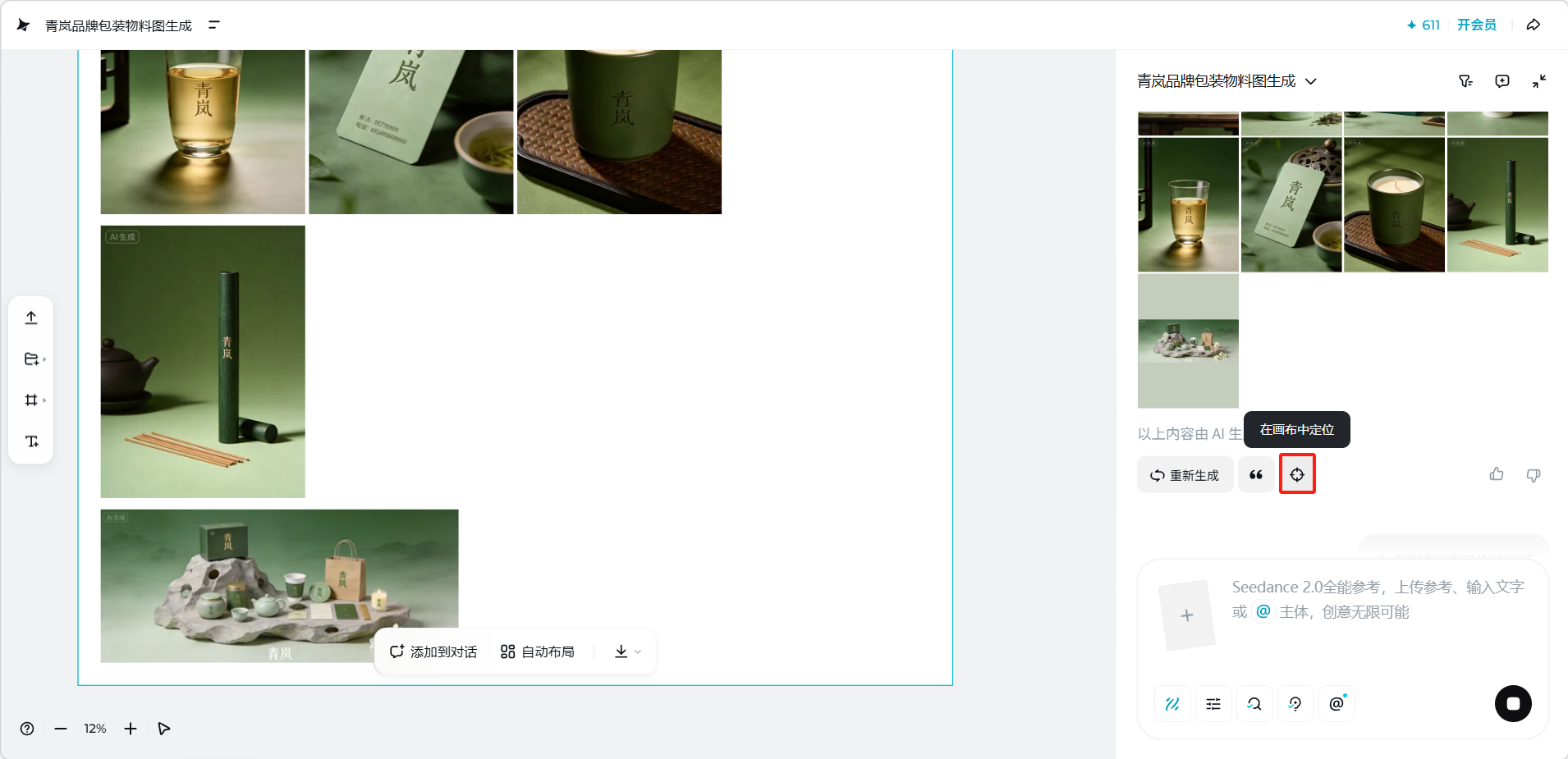 查找与定位: 画布内容多了之后,可以在 Agent 对话流中点击结果下方的「定位」按钮,快速跳转到对应内容在画布上的位置。