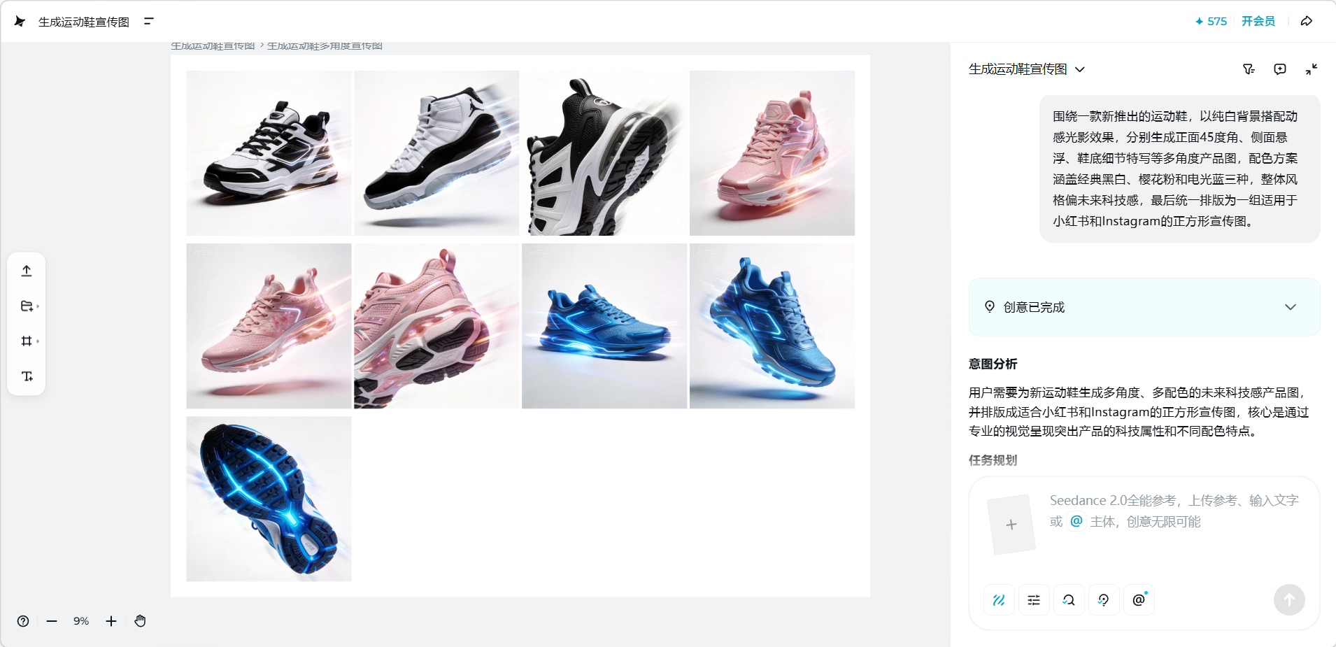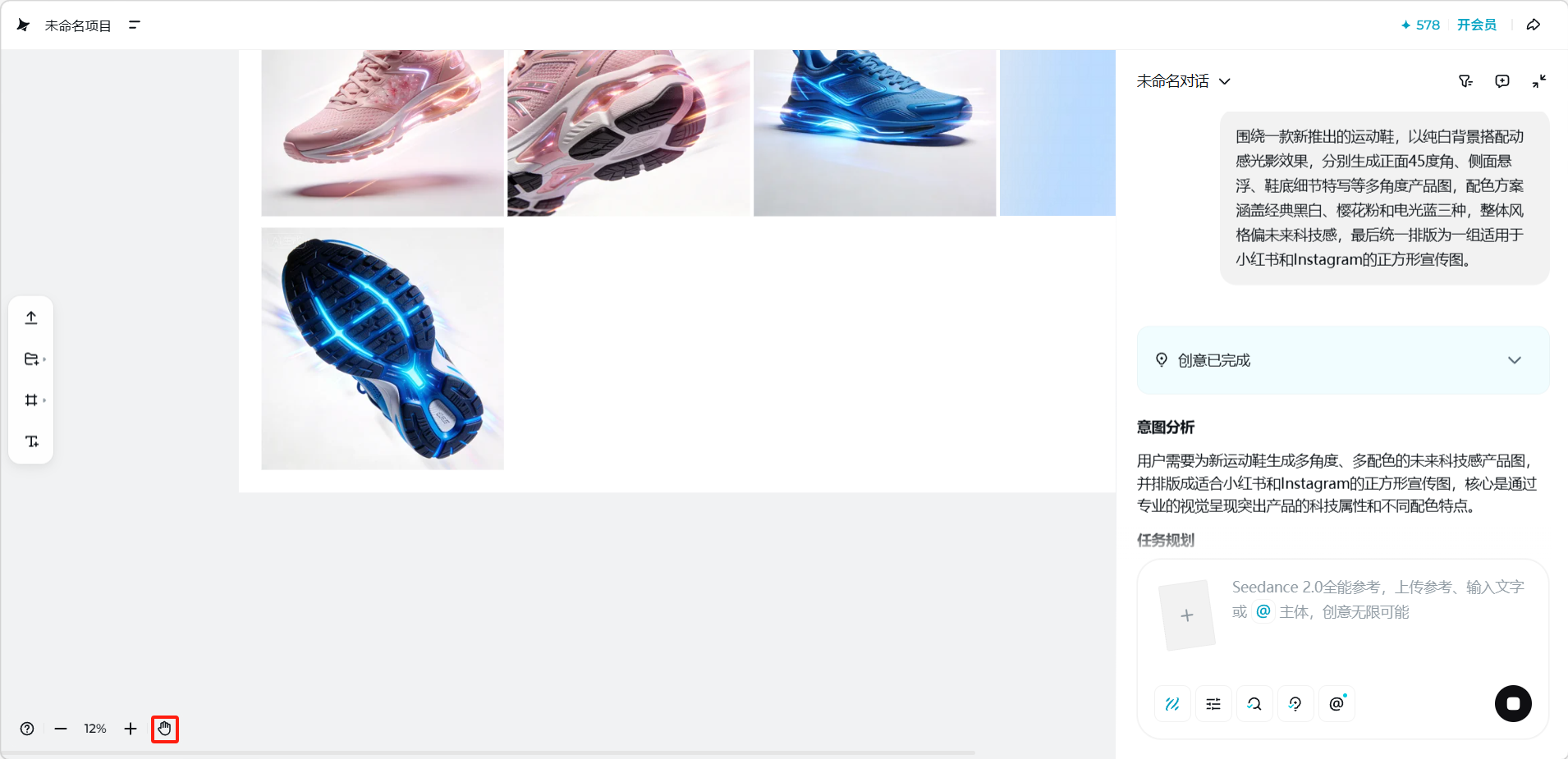拖拽与布局:画布以无限空间为载体,让用户可以在同一个界面内完成从灵感发散到精细编辑的整个流程。通过 Agent 生成的所有内容会自动归入画板,统一管理和预览。画布上的图片、视频、文本、画板等所有元素都支持自由拖拽和排布,方便你用最直观的方式组织创意。点击左下方按钮即可在选择和拖拽之间切换。